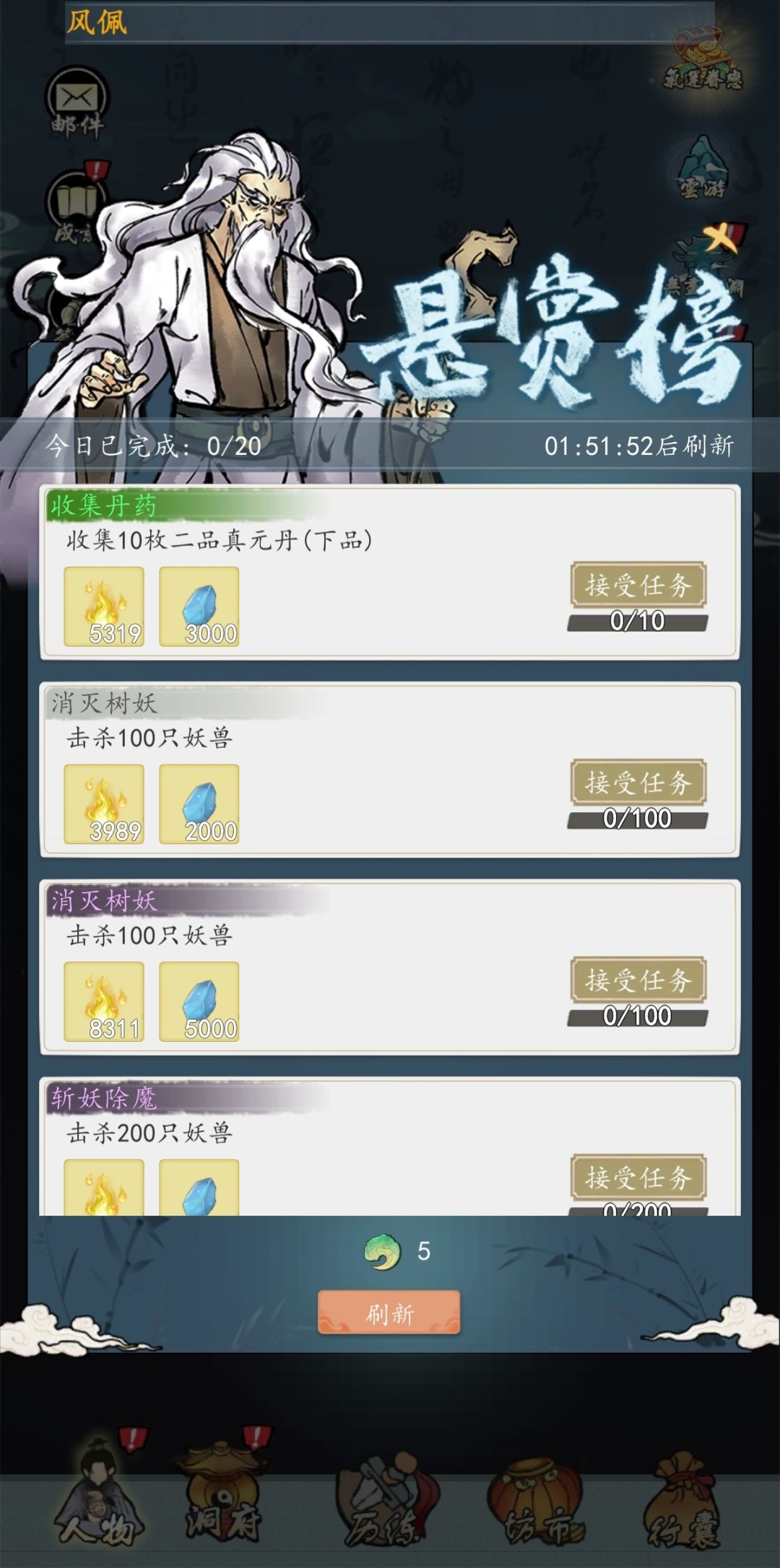 悬赏榜是游戏里获取修为和仙玉的一个重要途经 一,悬赏榜任务分五个品级,从低到高白绿蓝红黄,黄色奖励最多。 二,推荐先弄带仙玉奖励的,仙玉是里面的重要资源 三,对于任务奖励不满意可以刷新,一次5个玉。 四,每天二十环,如果当天可以进入下一个修为阶段,建议等升级后再接,这样利益最大