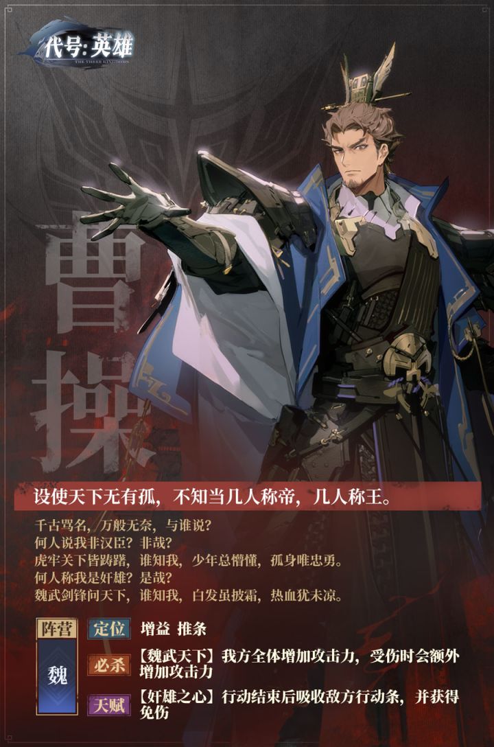 亲爱的玩家们,《代号:英雄》「星火测试」预下载已于今天开启,已获取资格的用户可前往商店详情页下载游戏哟~今天先给大家带来5位英雄的技能设定,游戏内更有超过50位各具特色的三国英雄,明天将会与大家在游戏中相见!一、魏国曹操:设使天下无有孤,不知当几人称帝,几人称王。甄姬:或戏清流,或翔神渚,或采明珠,或拾翠羽。二、蜀国诸葛亮:受任于败军之际,奉命于危难之间,尔来二十有一年矣。三、吴国孙