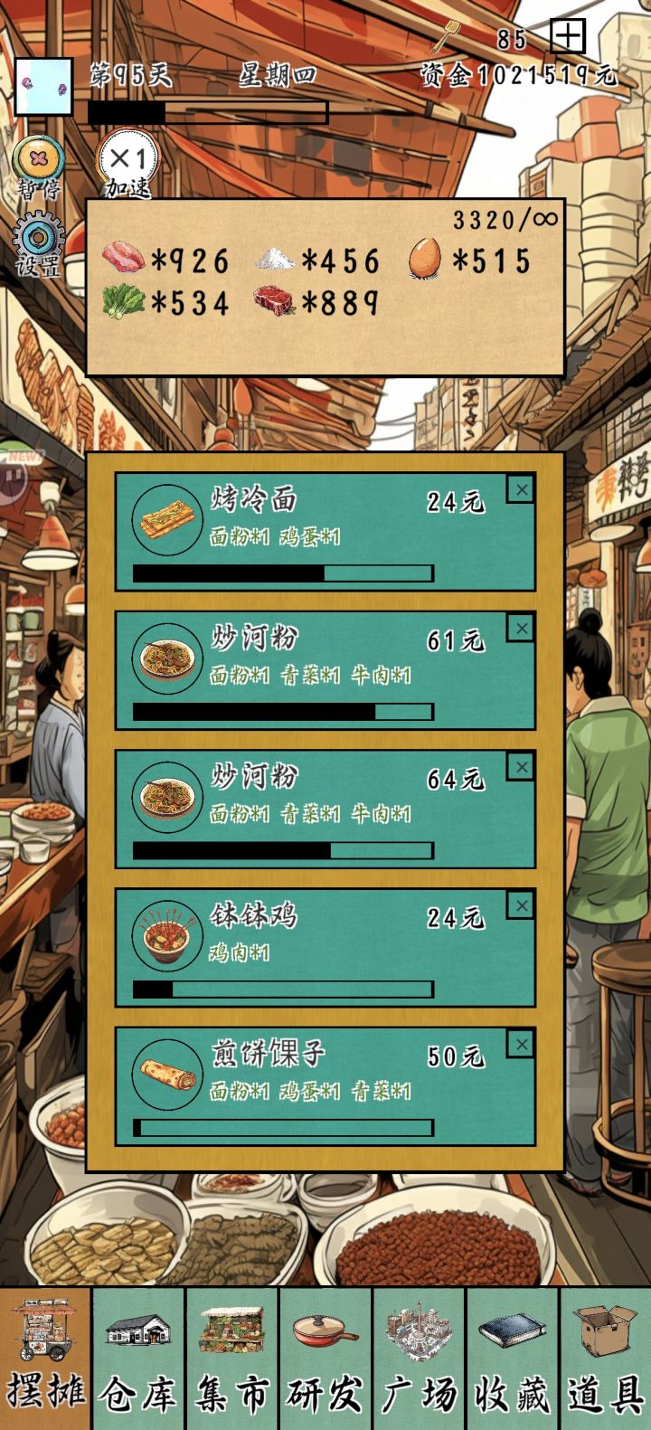 本人 是一次性速通(so如果有更好的建议可以提在评论区哦)我觉得这个游戏咱可以叫“成为资本家”分两部成为“资本家”前三十天 “资本的原始积累”+“定额财富获取”怎么做呢?万事开头 难所以我先讲开头一开始我们先要做的是去解锁新食谱(这个是随机的 看脸),然后去找看广告拿钥匙找杂货铺买表(呵呵不然真的很耗时间)买了就可以在界面开四倍速了。然后市场买面粉or土豆卖烤面筋和土豆片赚快钱把第