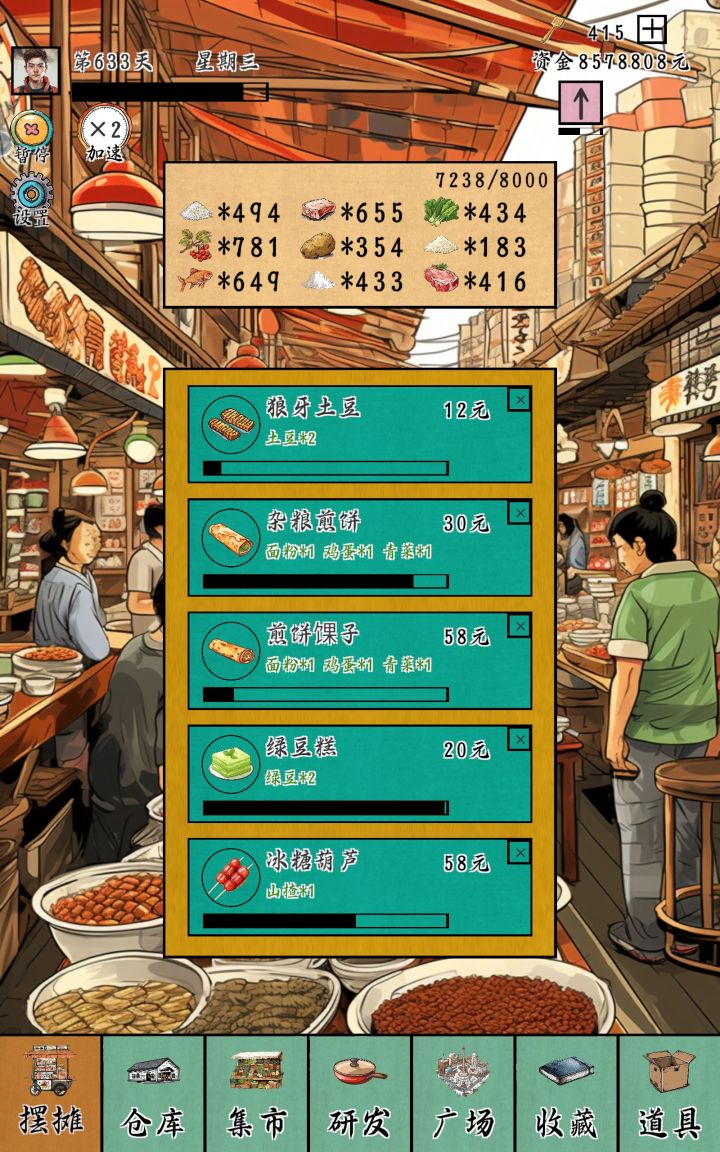 本人 是一次性速通(so如果有更好的建议可以提在评论区哦)我觉得这个游戏咱可以叫“成为资本家”分两部成为“资本家”前三十天 “资本的原始积累”+“定额财富获取”怎么做呢?万事开头 难所以我先讲开头一开始我们先要做的是去解锁新食谱(这个是随机的 看脸),然后去找看广告拿钥匙找杂货铺买表(呵呵不然真的很耗时间)买了就可以在界面开四倍速了。然后市场买面粉or土豆卖烤面筋和土豆片赚快钱把第