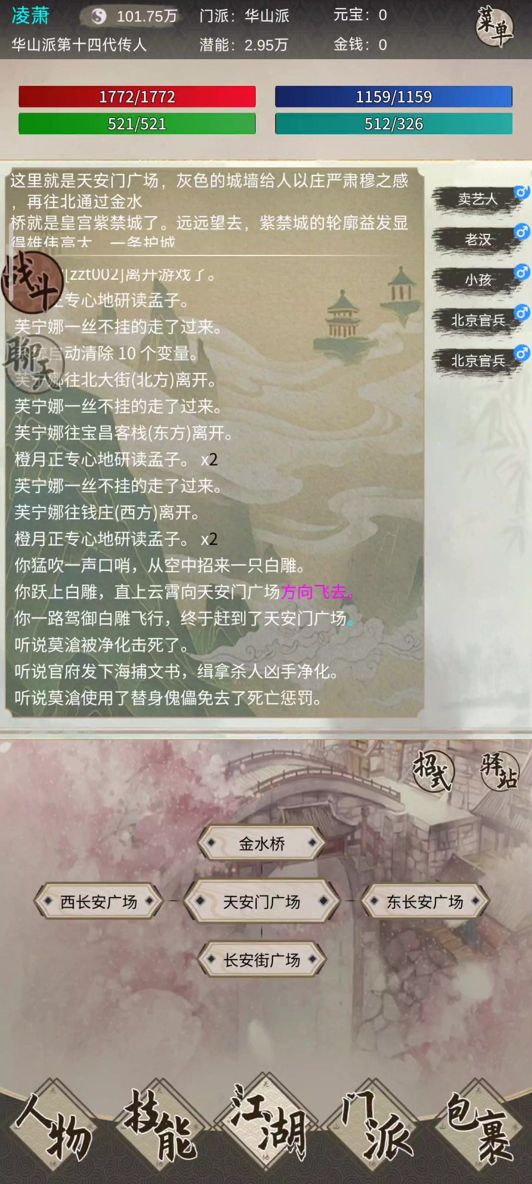 这里依旧是逍遥混神灭,这次来讲一下逍遥派(需要38点悟性24点根骨)的入门流程,首先,新手出生在中央广场,这里需要点击人物随后领取所有礼包,然后沿着北大路往上走两格,向左来的武庙,随后去找巫师,领取丹炉和储物袋,接着点击门派,选择逍遥派,随后就会出现如图一样的门派界面,随后直接飞到宿星河,像素心和学习基础内功,基础轻功,还有逍遥心法并且拜师,当你这三项学到120级时,并且建议第一天晚上挂机打鸟(需