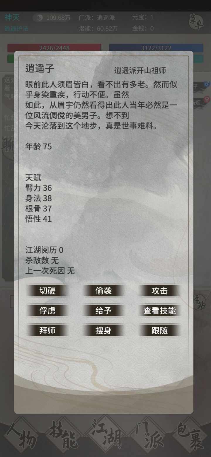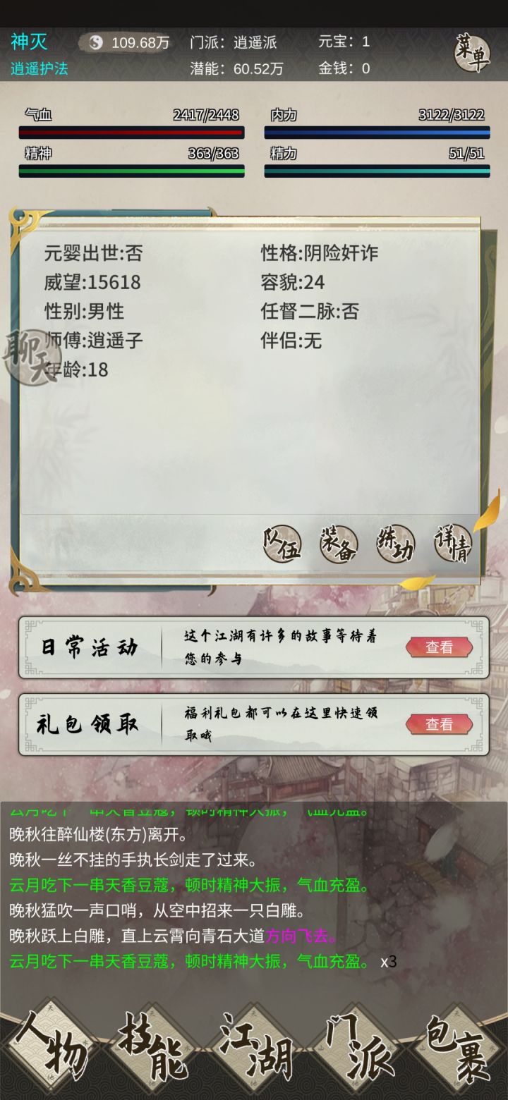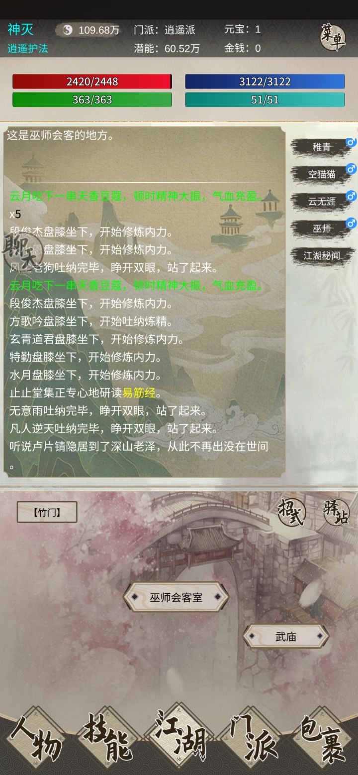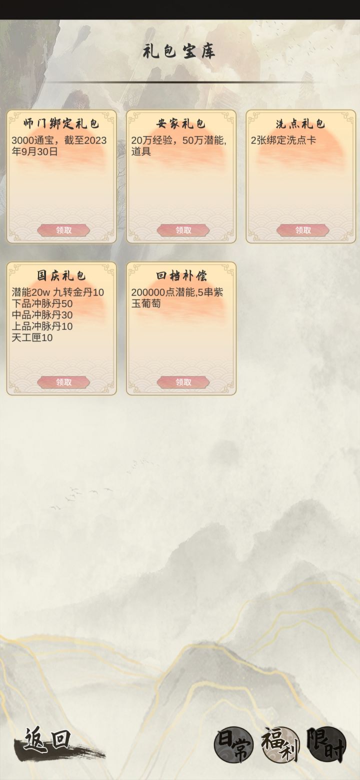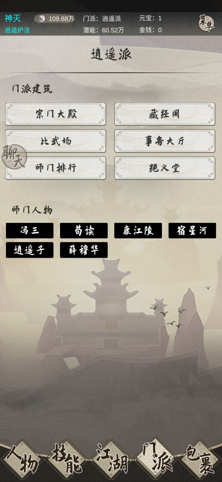 注册进入游戏后,第一件事就是签到+领取礼包现在有国庆活动,奖励非常丰富。记得加群找群主领tap专属礼包,礼包码前往中央广场-黑市内进行兑换。领取完后,可以先在群看看你想要入的师门,师门可以随便脱离,门派专属武功是会掉的,基础技能不会掉。然后就可以点击日常活动进行打鸟了,前期潜能获取方式巨缺无比,而获取潜能渠道只有打鸟任务(可在武庙离线挂机,实战经验100w以内可以获取奖励)、师门(师门100