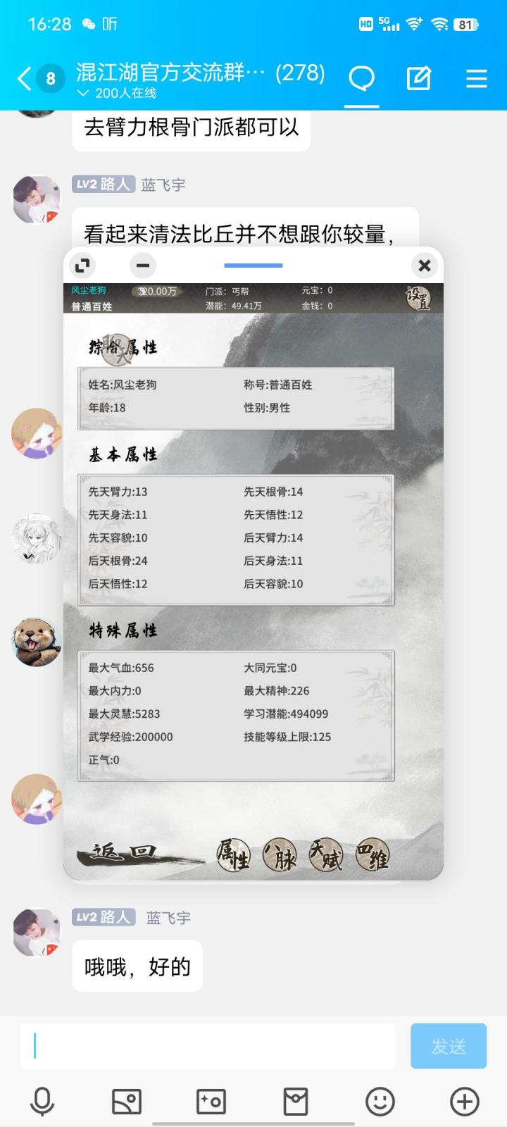 这是走入江湖的第五天,这张截图是第一天刚玩的时候弄的,第一天的时候还是一只小萌新,