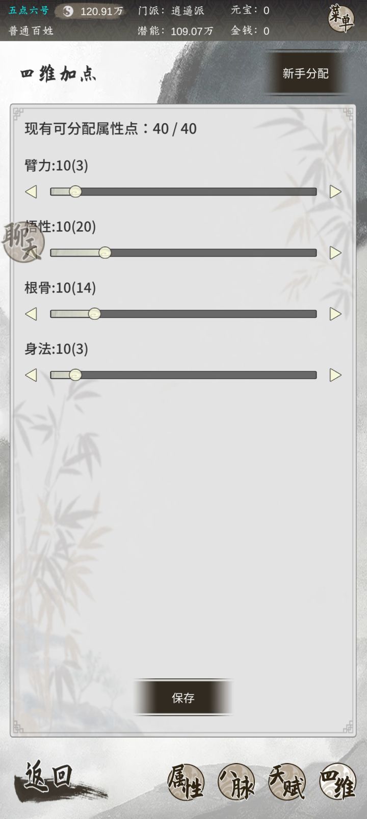 四维:高悟性加点,13 30 24 13,将仙丹吃满,悟性大于等于32,根骨大于等于24。天赋:六道轮回或如鬼似魅或鸿运当头。进入游戏后可通过门派-选择墙头之草-选择逍遥派。逍遥派的首席活动以及任务发放都由宿星河负责。逍遥派的青冥神功系数18,内功一流,还可以学习悟性专属的超强轻功凌波微步,当然流派不会十全十美,伤害也不会很高。前期的我们潜能十分缺少,如果想省的潜能,我们可以在康江陵处拿棋