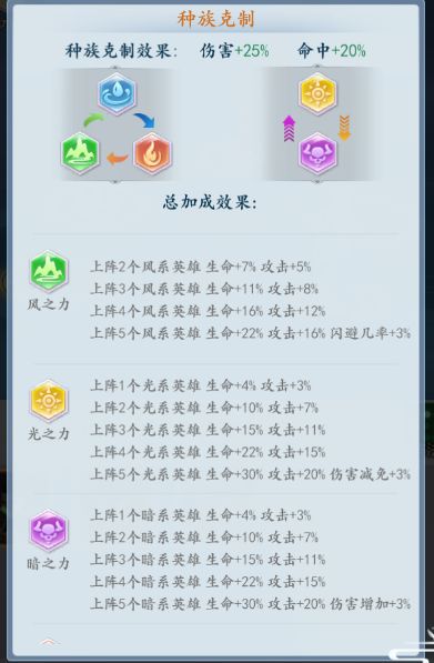 1:类型定位英雄分5个类别,分别为风系、水系、火系、光系、暗系。每个类别有4种类型定位,分别有、辅助、战士、法师。坦克,一般站位在队伍的最前排,自身拥有高额生命与伤害减免属性。辅助,一般站位在队伍后排,给予我方队友增益BUFF或给予对方队伍减益BUFF。战士,一般站位在队伍前排,给予对方队伍极大伤害。法师,一般站位在队伍后排,给予对方队伍极大魔法伤害。2:英雄培养A.英雄获得经验升级,升级会增加