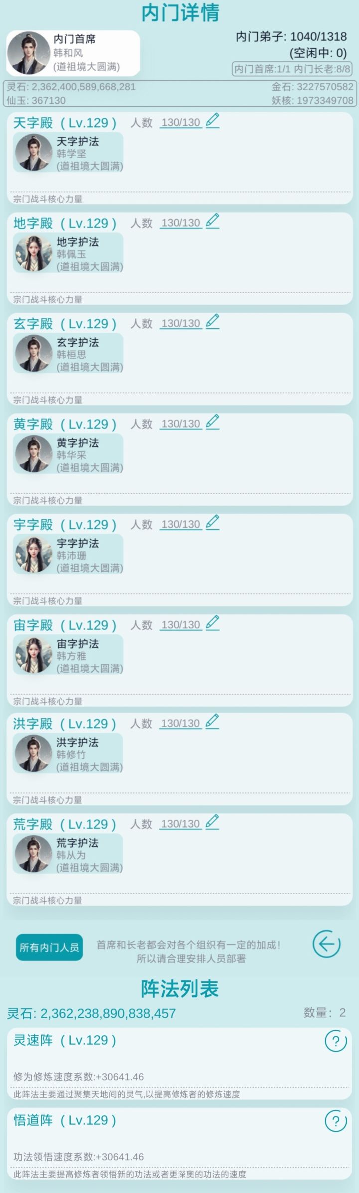 没想到吧!时隔两年还有人玩这游戏。现在来说下玩到目前为止的攻略这游戏我愿称它为举全宗之力助我飞升,没有宗主的话,弟子早就飞升了弟子前期资质差的一批,而且外门弟子还有修为速度减半的debuff,宗主不但不减半还有30%的加成,修炼速度居然也快不了多少,如果不磕渡劫丹药都不知道要失败多少次,我金丹九层,弟子都有金丹二三层的了,要知道弟子完全没有丹药嗑的,就硬着头皮强行突破。1.开