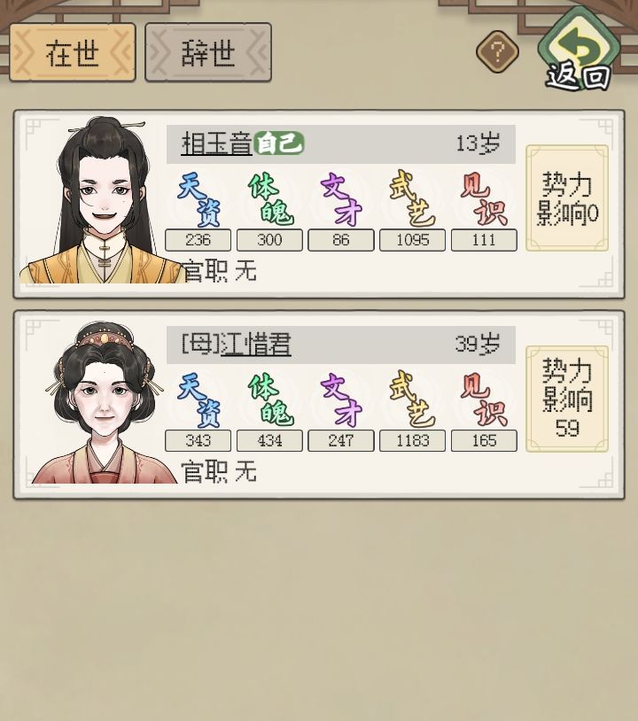 感谢各位用户对我们的支持,根据大家的反馈和建议,我们在刚才提交了一个新版本至平台审核,预计晚些或者明天会过审,届时大家记得更新哦! 1.0.1版本更新内容如下: 1. 调整继承时一定需要同姓后代的设定,修改成只要后代就可继承 2. 提前了科举玩法的开放时间以及减少举办科举的CD时间 3. 新增属性的说明提示(点击成员界面的问号图标展开) 4. 新增科举及升官规则的说明提示(点击科举界面的问号图标展