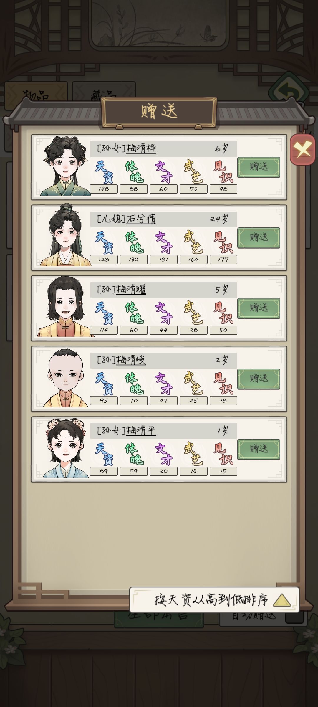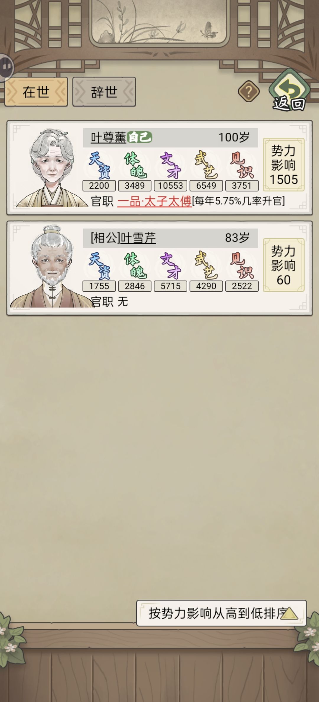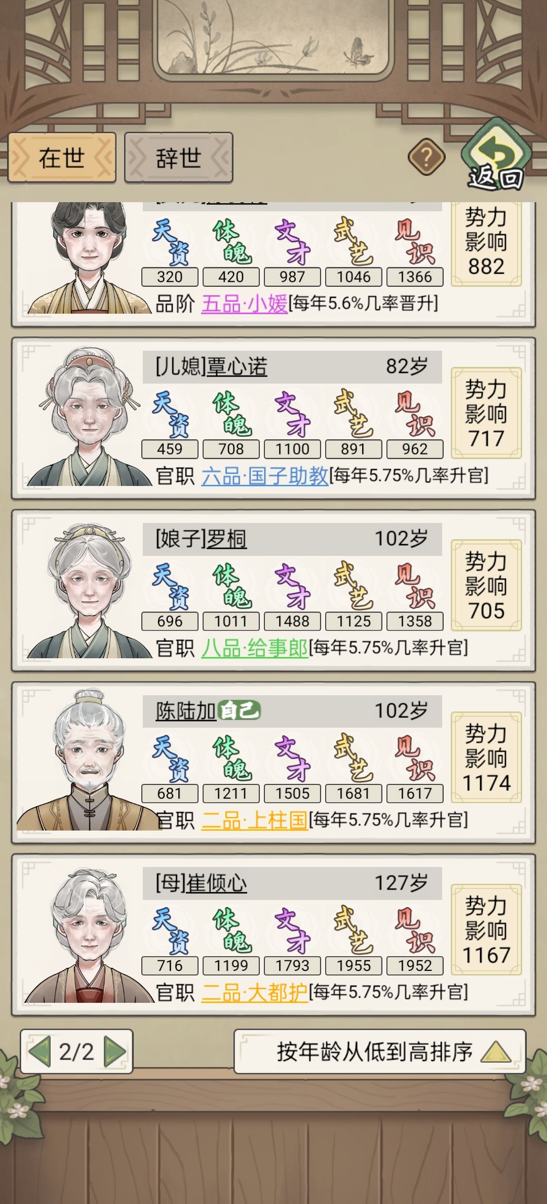 怒肝十几个小时,实现广陵邱氏362年历史,44岁一品官,6位一品大官,110位族人过半在朝为官。 建议开局选择鼓励生育政策,16岁成年,随父姓。 一、属性 1、优先级:武艺>文才>体魄>天资>见识 2、武艺和文才是做官的核心,但武艺可额外通过赠送武器和祭祖中使用元宝进行更多提升。 3、体魄越高活的越久。 4、见识仅限女性且选秀后封官不可再提升。 5、天资越高越爱生且生的越多。 6、结论:主武艺,辅