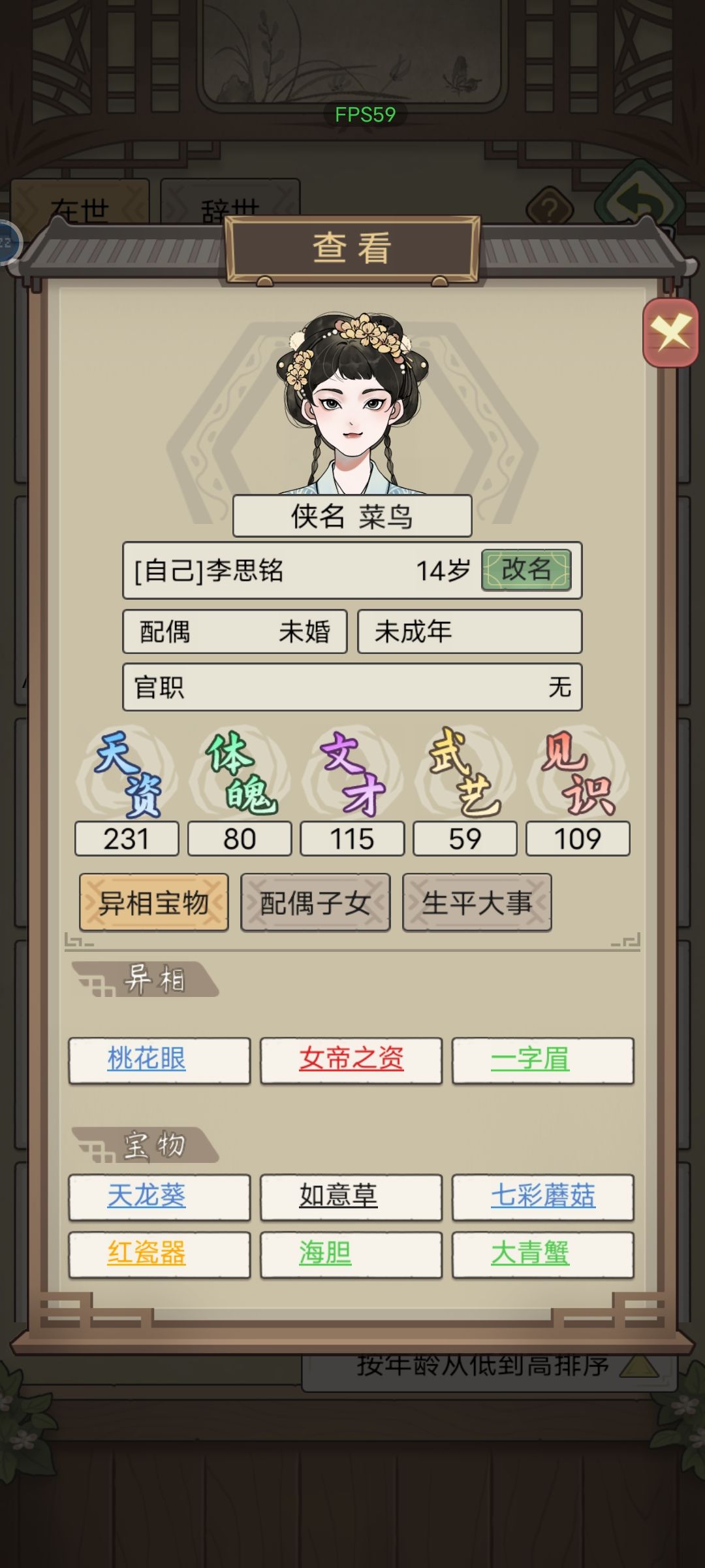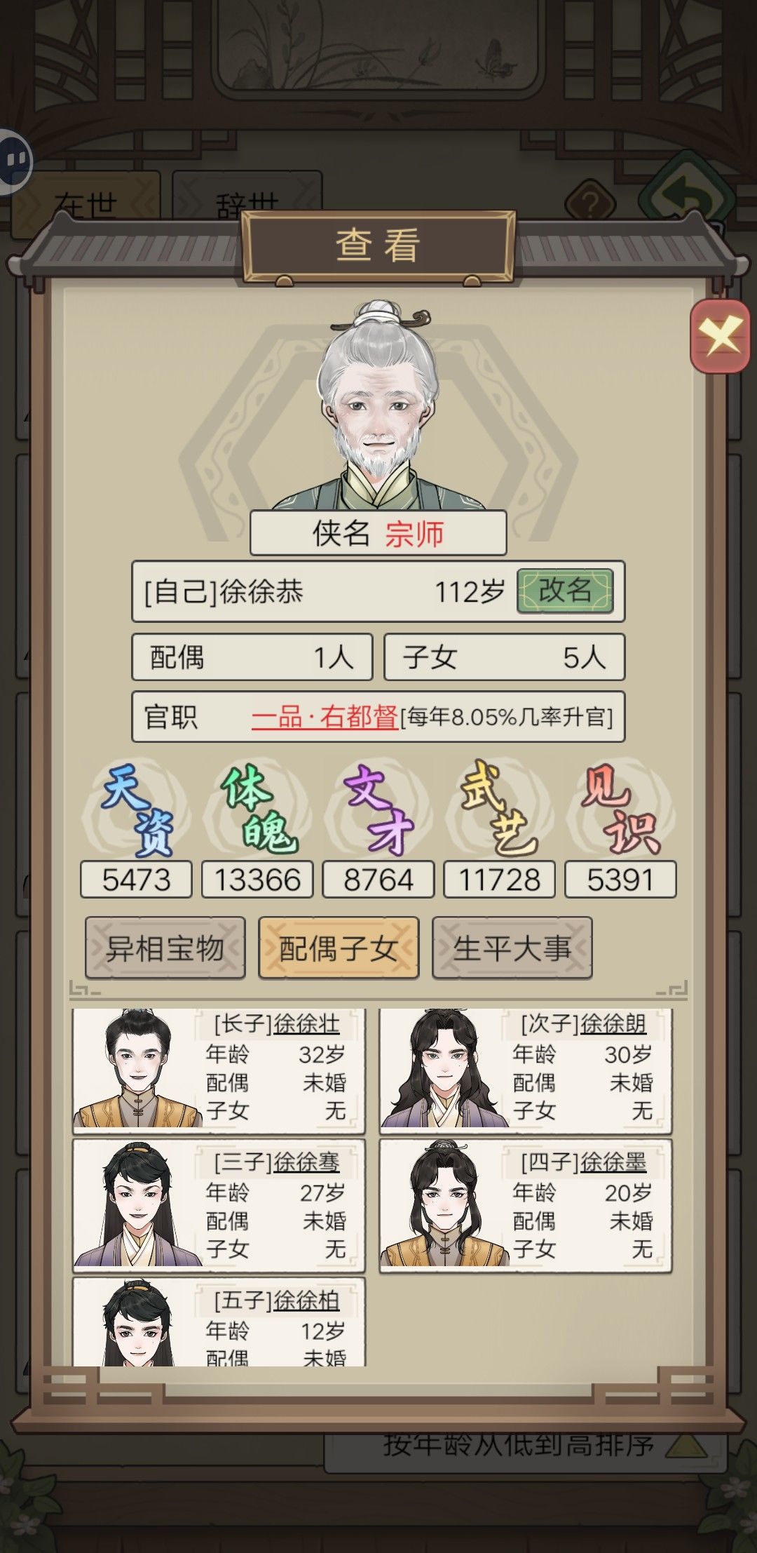 办法:加天资娶新妻(详情如下 光顾着让子孙学好文武艺,就没有注意结交天师半仙们,然后慢慢的第四五代的娃娃们都不怎么爱生娃娃了。然后又不小心选了一个三十好几岁的男姓已婚无娃的传承人,之后的几十年,把上一代送走就剩老两口子了,研究了一下他俩的属性我想,是不是能生娃的年纪里他俩的天资太低,现在虽然天资高,但是女方年纪大了已经不给生了? 于是我做了下面两个操作。 1、得把另一半空出来,然而除了熬死她我没有