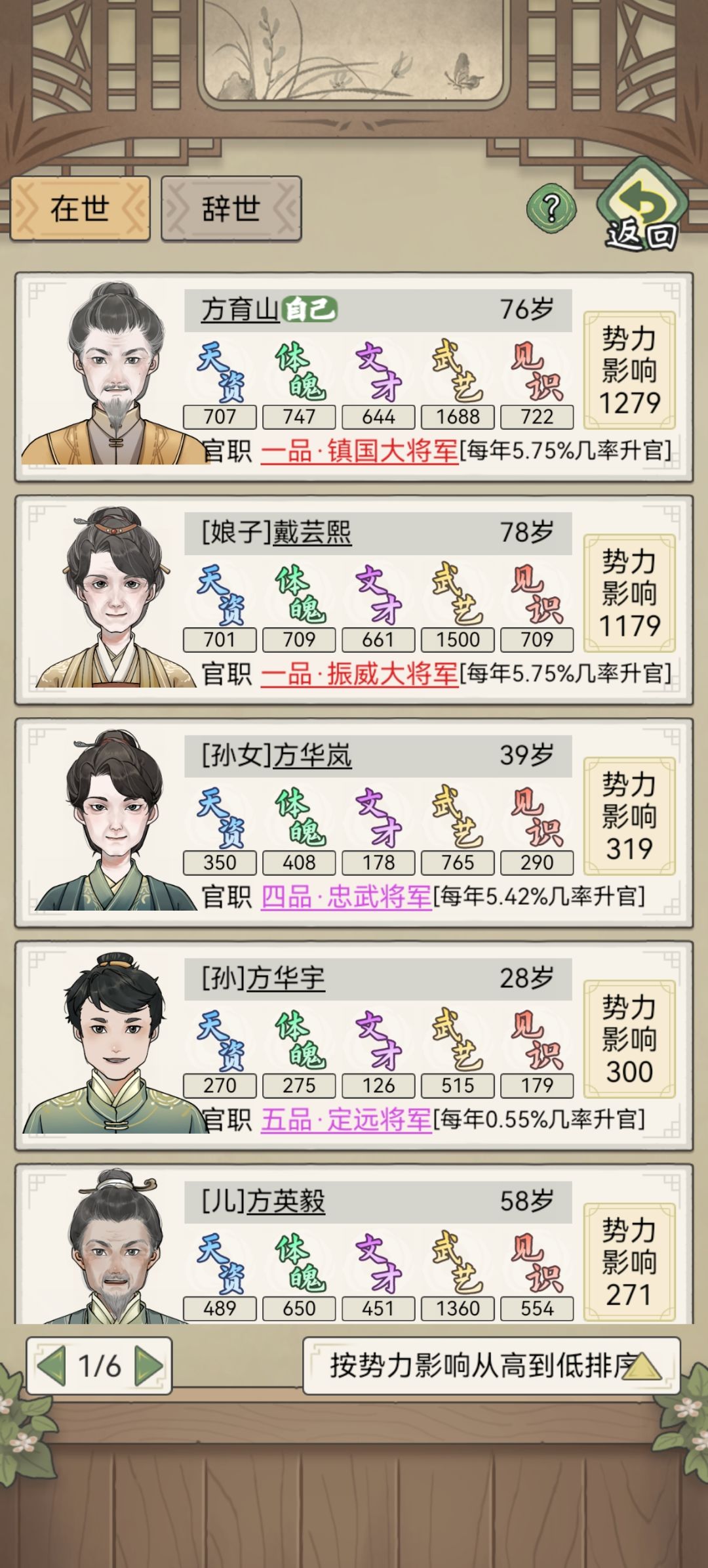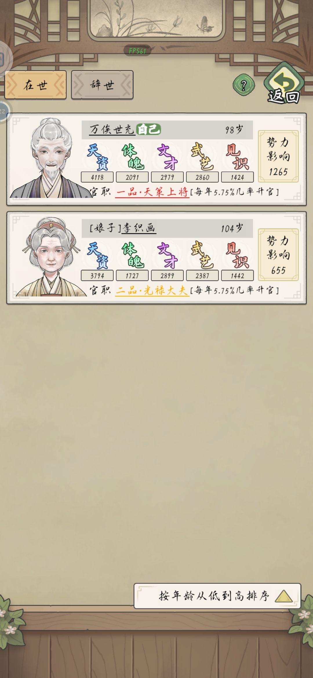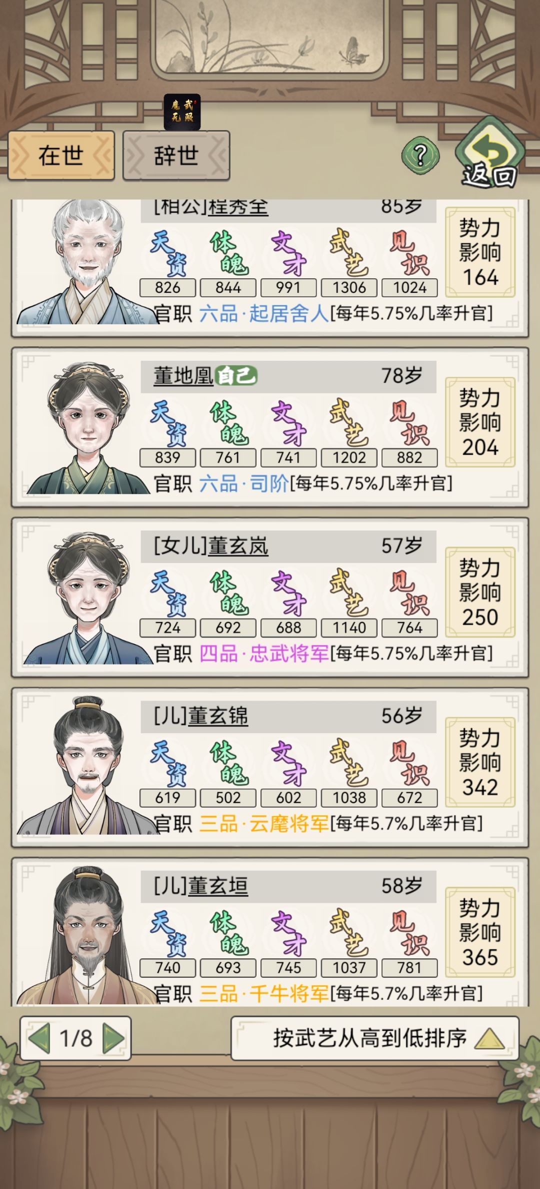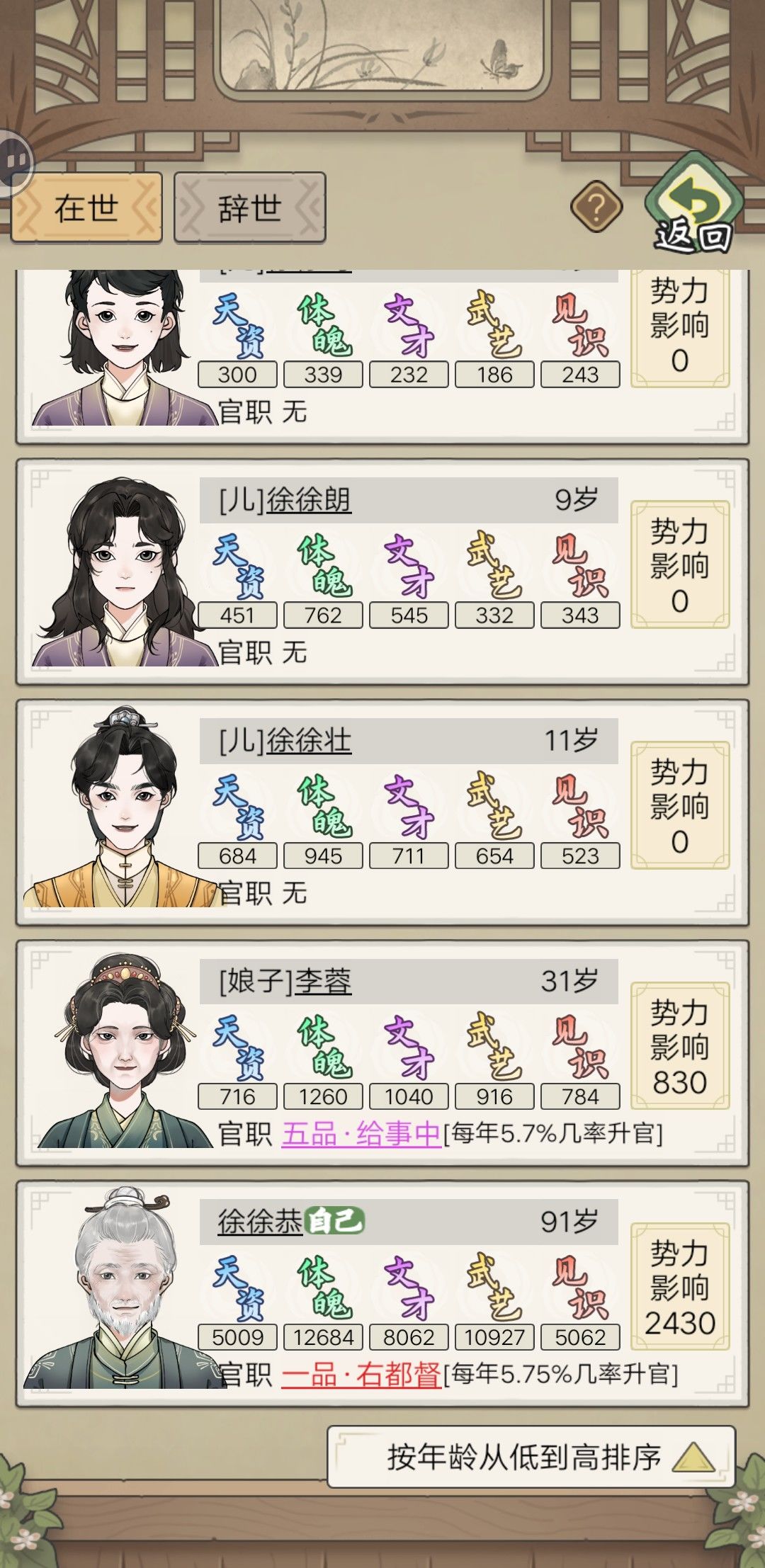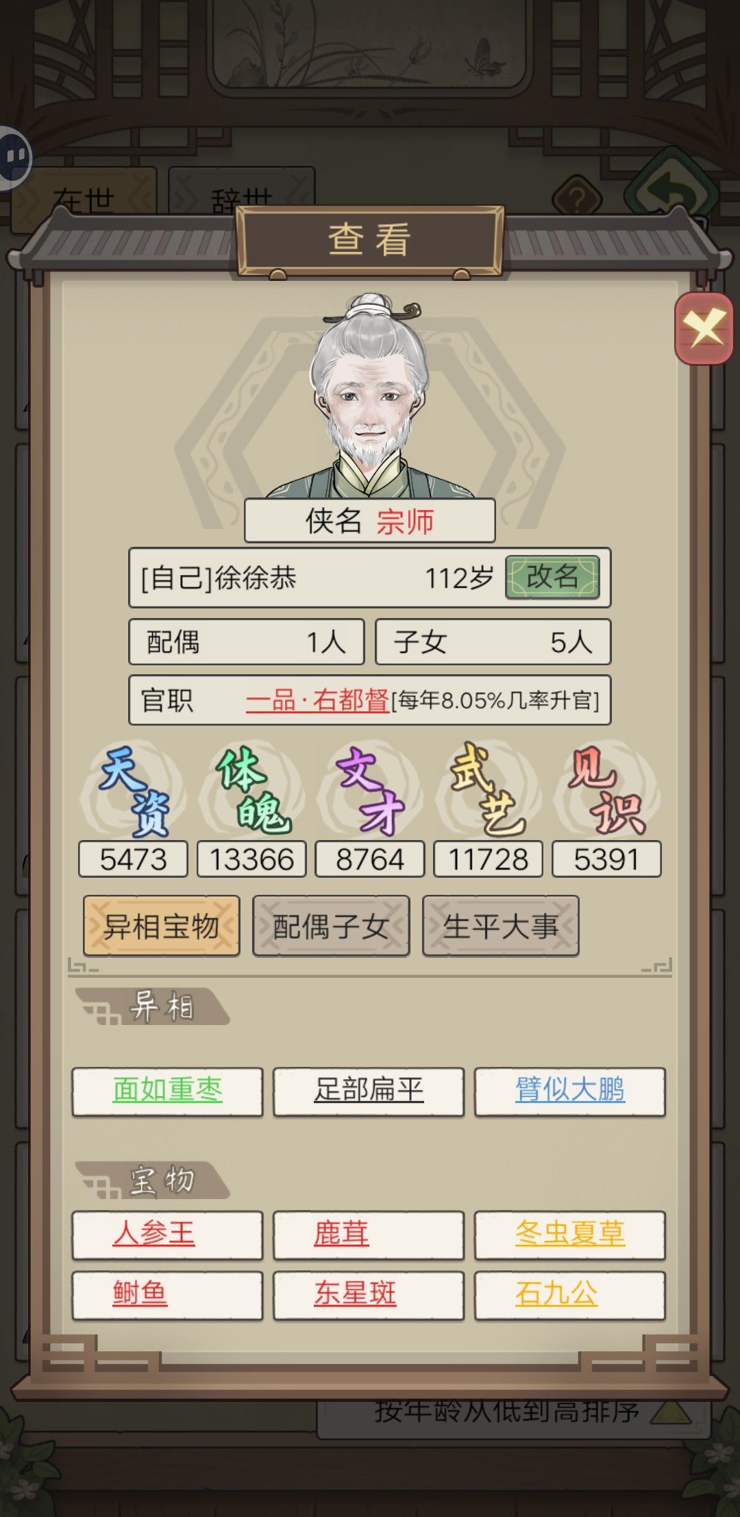 玩了几天写个攻略,到此一游! 我是在子随父姓条件下玩的。 发展规划: 一,宝库1岁就开始赏赐(只培养嫡系,默认红色宝物)用来规划方向 武官:双武,双体魄,双资质(儿子,孙子) 文官:双文,双见识,双体魄(儿子,孙子) 选妃:双文,双见识,双体魄(女儿,孙女) 二,人脉只选择资质,武艺,文才。个人认为资质比体魄好,选择资质间接体魄也有了,而且该长寿的长寿,该早点挂的早点挂,大家慢慢体会。武艺,文才当