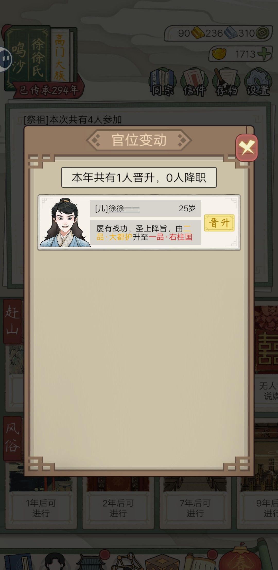 2023年11月26日更新至1.0.2版本,其中一项更新是“ 新增功能"重启人生",可主动选择结束当前人生从而开始新的人生或者进行继承人生”。 经测试,开局做完新手教程,就可以使用“重启人生”功能,然后看两个广告用元宝把同宗升到4级增加240势力,就成了一母一子(或一女)240+势力小族2人开局,投壶(10势力)、善举(30势力)、赶海(75势力)和风俗(150势力)已经开放。