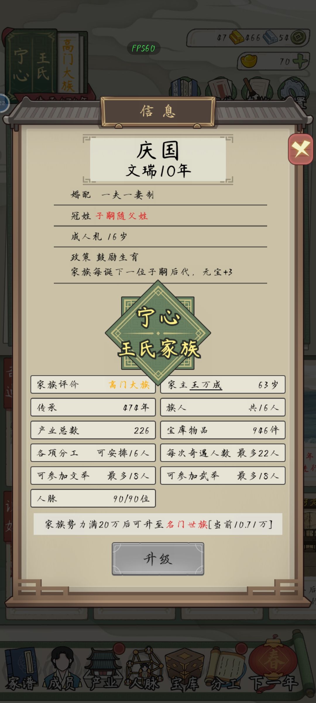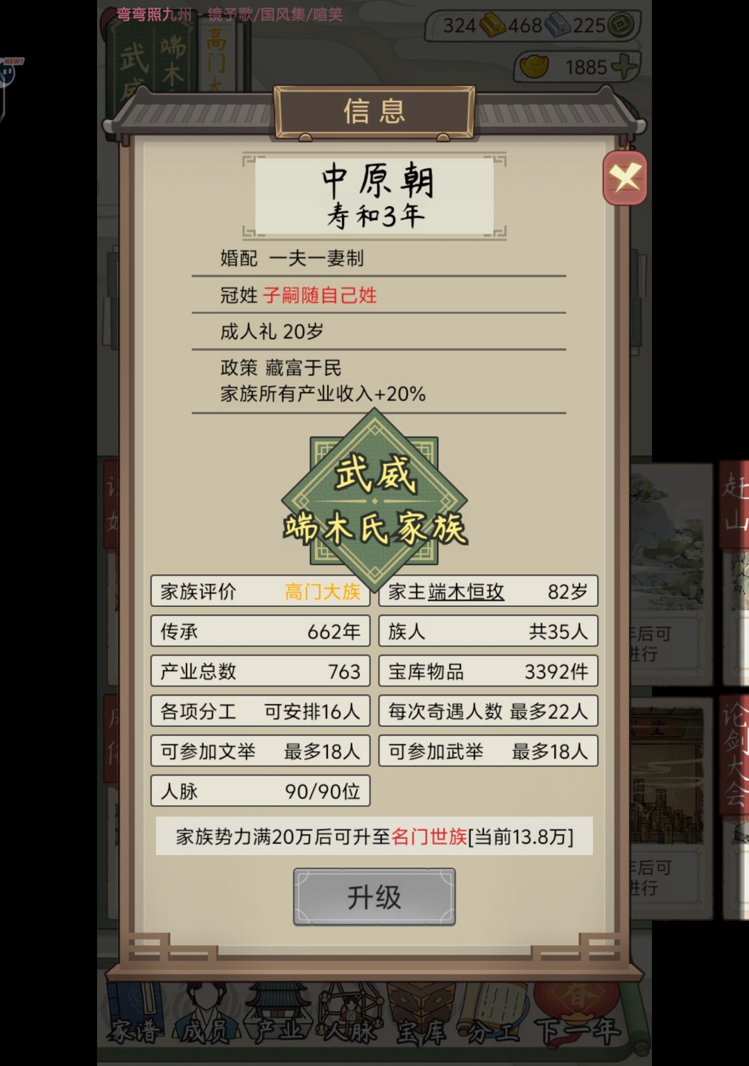 传承四百多年,已经进入垃圾时间(指钱多到没处花,就等着刷到红名家族了 初期确实很拮据,钱都要省着花,时常在破产边缘徘徊,但等产业积累多了月入300银,人脉分工拉满都耗不掉。 我用元宝也很抠,所以现在攒了一大堆,感觉这个元宝真的不关键,重roll不如直接sl,加的属性也就那样…一句话,后期都不缺 然后是重点:少生优生[表情_看我的]。一开始我会给每位子孙都找好配偶,让他们蹭蹭地生,但后来我发现了一个