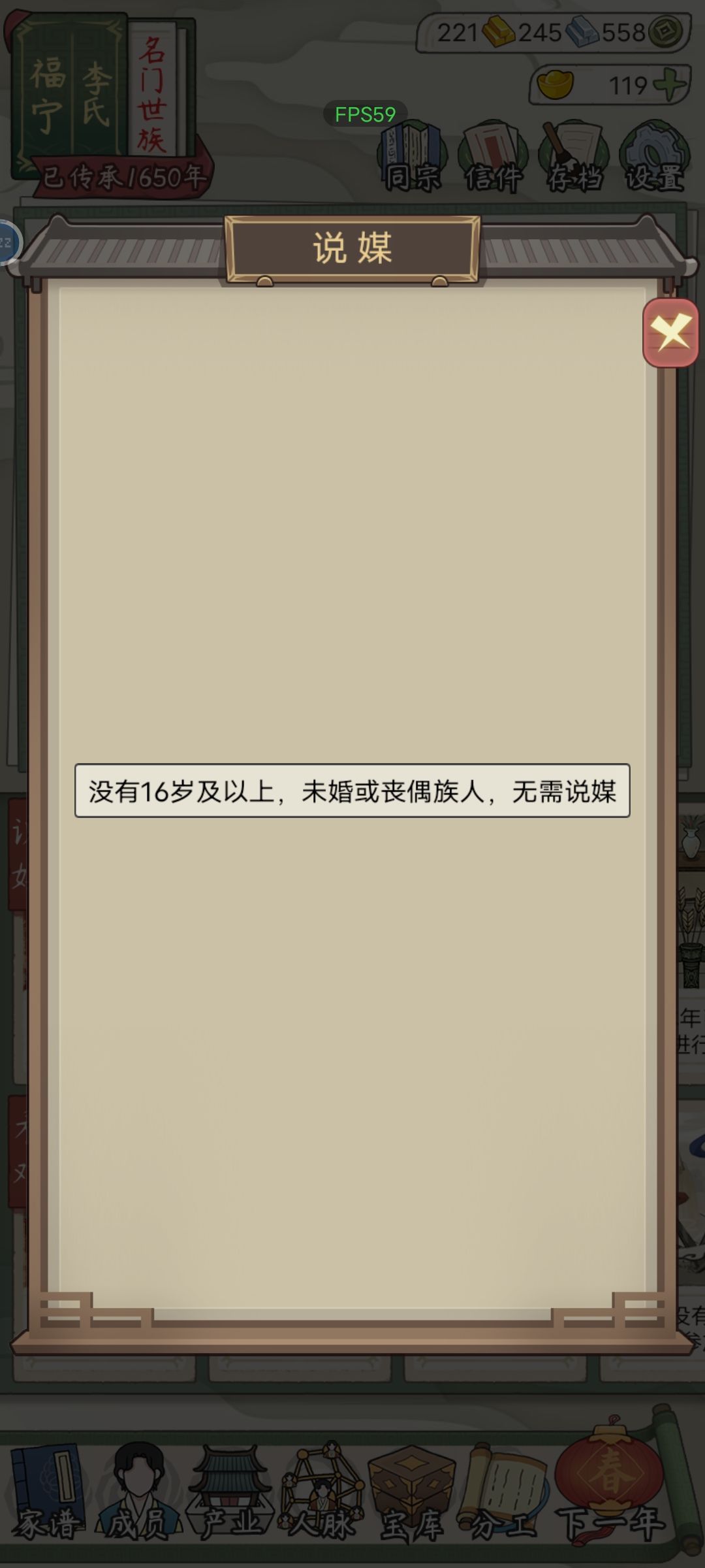 说媒:找一些属性看起来比较好的就可以,因为你的家族会培养的,等后面说媒的概率低了,我们不要用元宝提升概率,联姻更好。 家族关系:感觉没什么用,唯一一个大作用就是联姻,其他的属性什么的可以不看的,这些家族有的时候还会和你闹矛盾,联姻就可以,往来真的没必要。 善举:这里面的任务一定要全都做完,因为这个能给很多族人属性。 要务:这个东西随便做做就行,奖励真的不如赶山和赶海,后面有了分支就更没有用了。 科