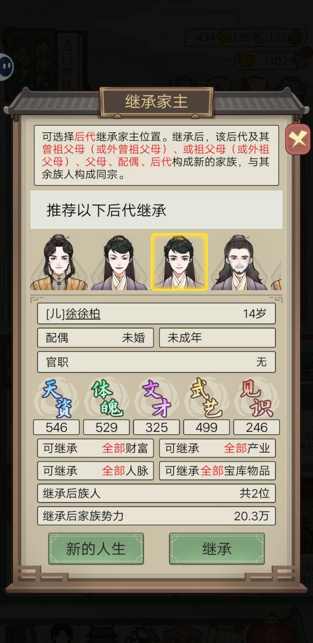 最简单的捷径就是建号以后屯元宝,先屯几天元宝,存档以后再开完,不然一天元宝就那么几百,好的属性道具和剧情处处离不开元宝,会很曲折。 开局后基本一代开荒,优化基因和异相,选随自己姓,挂掉的时候尽量选孙子或者曾孙辈分里天资好年纪小的,这样二代家族基本就可以到望族,三代再选后辈里年纪小天资好的,这样三代差不多就能到显族了。 关于家族发展,个人觉得最简单的就是偏文或者偏武,这样后代基因基本属性加成比较一致