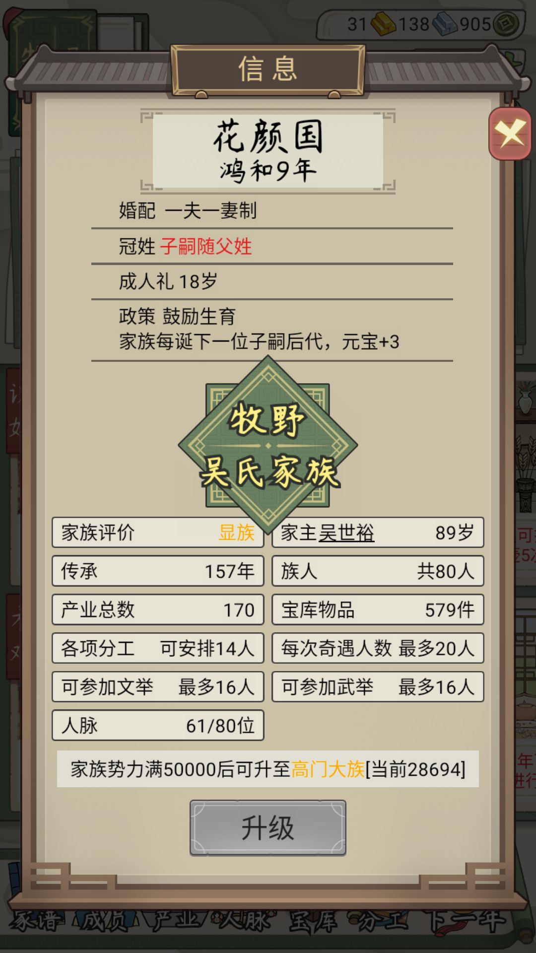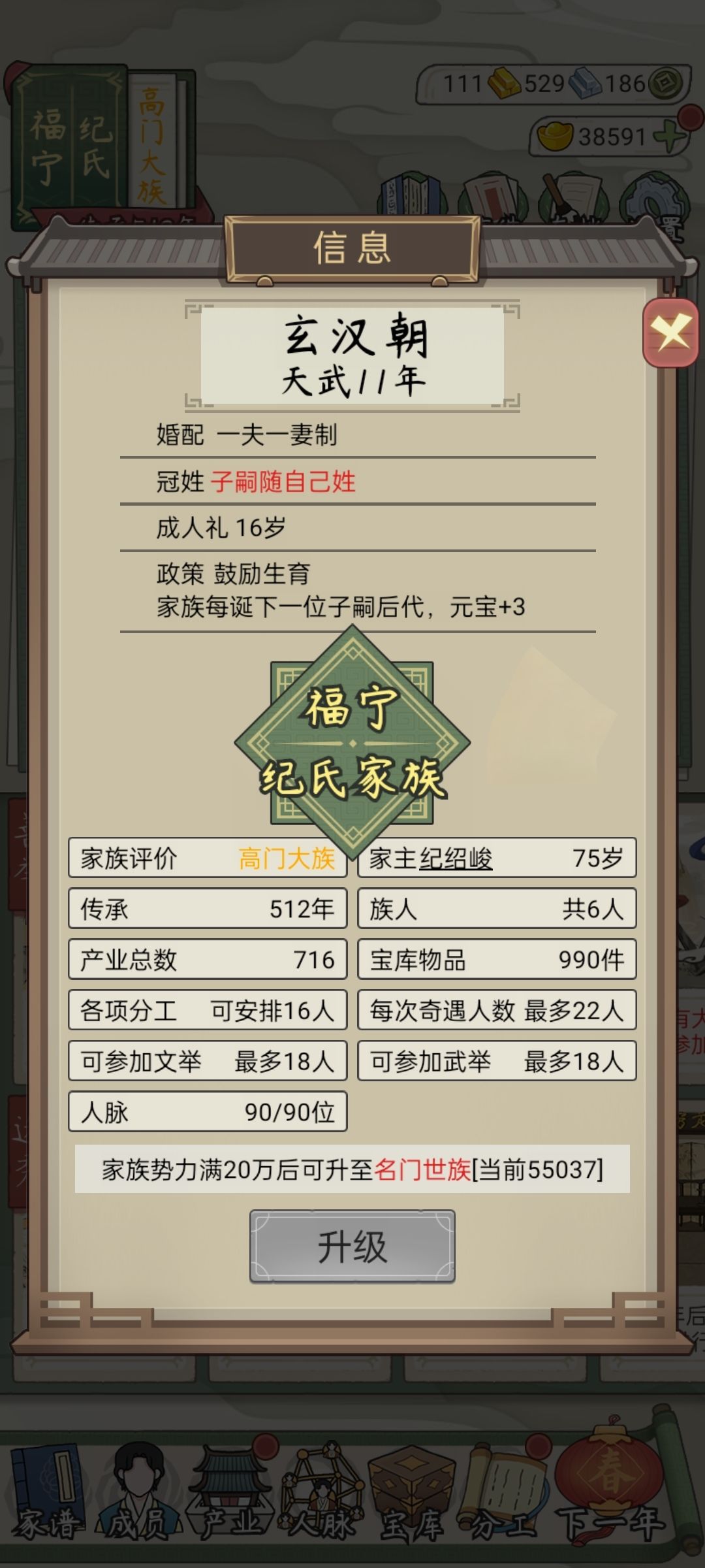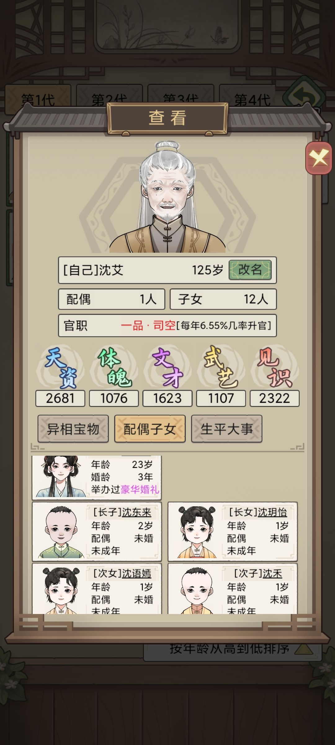 开局一定要选,随自己姓和生子嗣+3元宝,否则后面容易断代 人脉非常重要,尽量看广告,全部弄成红色的,可以+5属性,这个可以传承非常的好 继承人一定要选继承全部和年龄小的 最后总结有肝你就,一肝一个不吱声!!!
