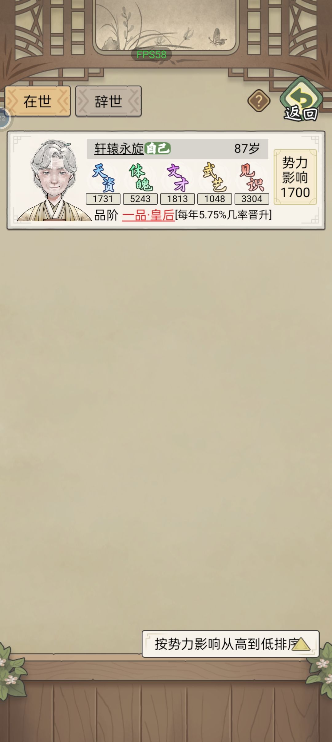 有一说一,在玩法上可以加很多东西。 1.家里的老祖宗是朝廷一品大员,是不是在朝廷上有着自己派系,弟子,同僚。在上面可以开发一些新的玩法 2.家里面有多个一品大员,后代的直系是不是应该升官的概率提高。但是可以在边上加一个野心率和怀疑率。一个是对朝廷造反的野心,一个皇上对其的怀疑。造反率超过一个值触发造反事件。开发新的玩法了。怀疑率的上升应该是突然上升或下降。超过一个值触发冤案事件(野心率低)或者灭门