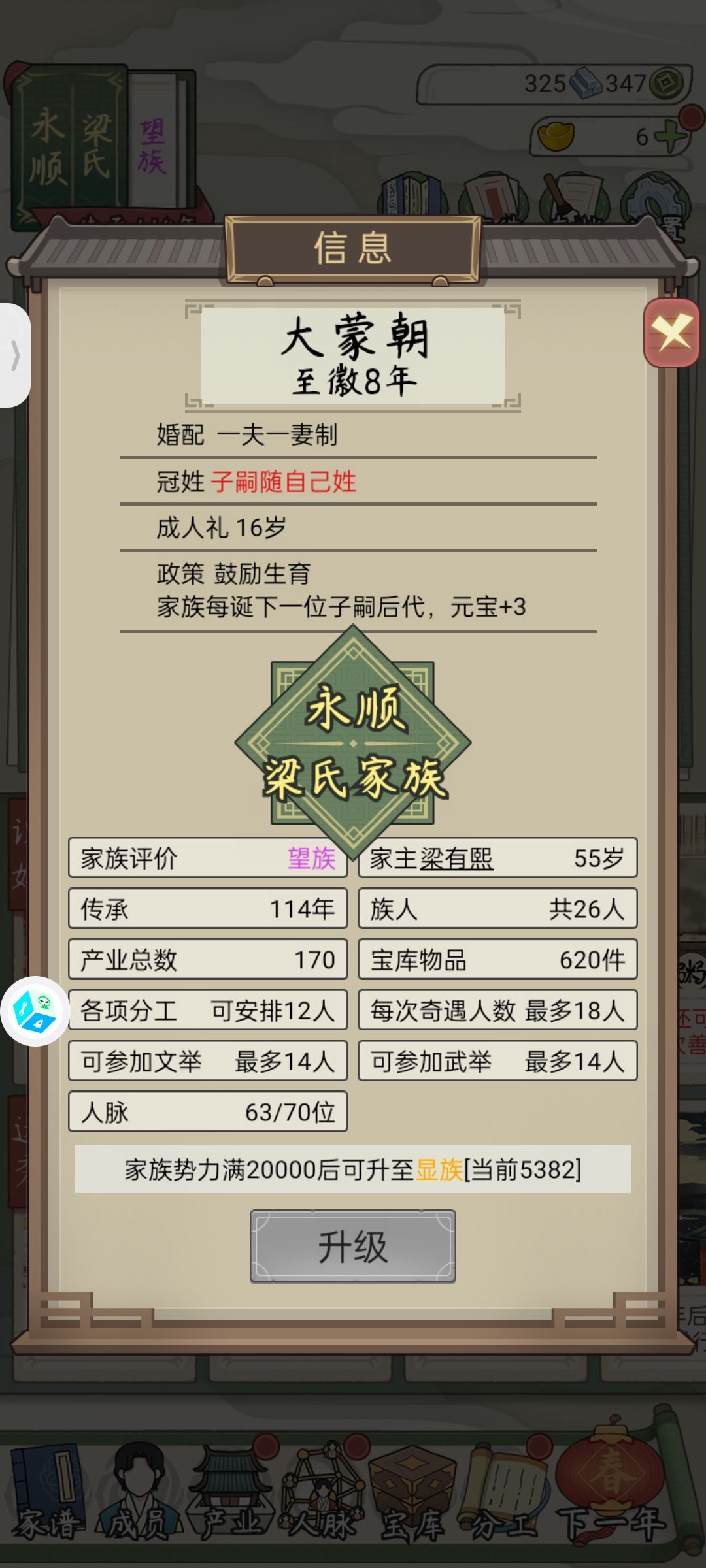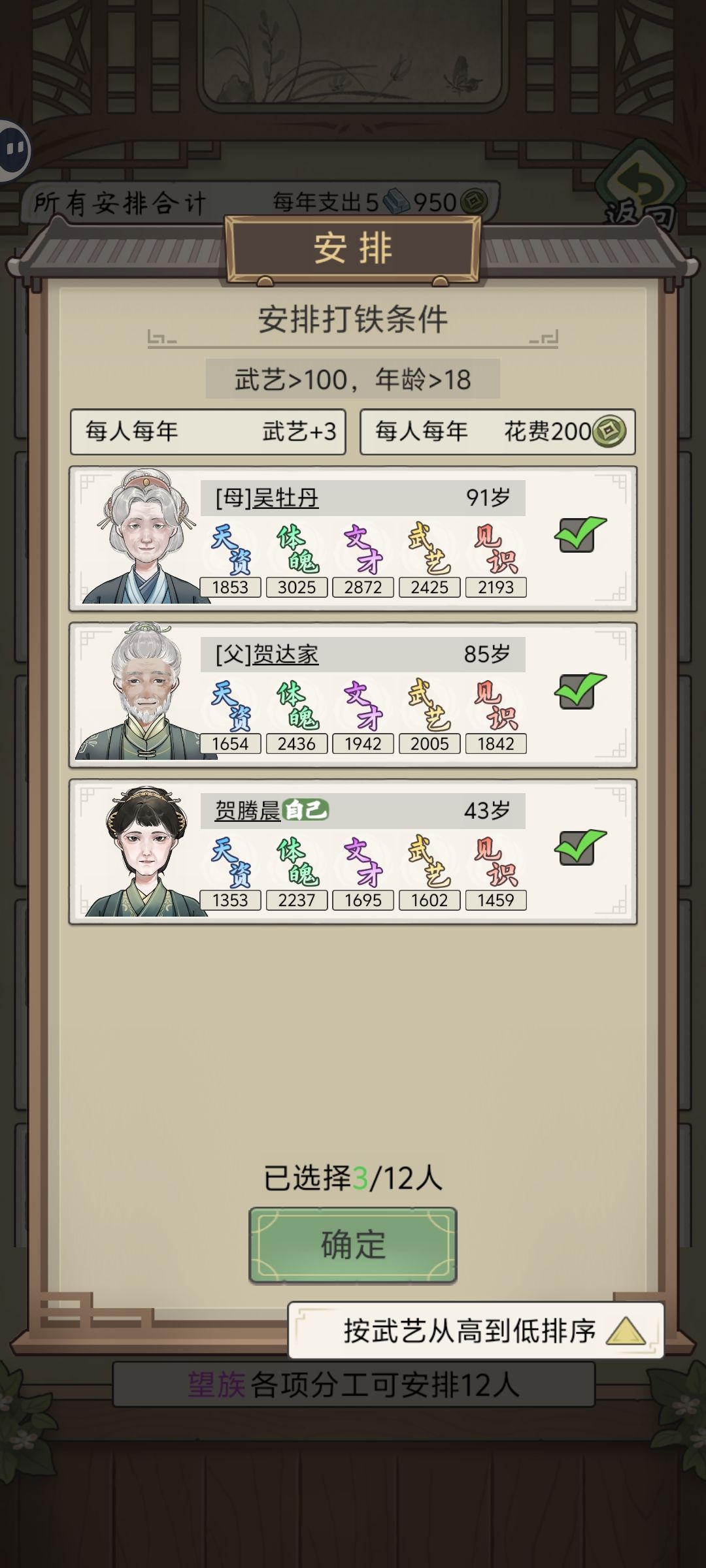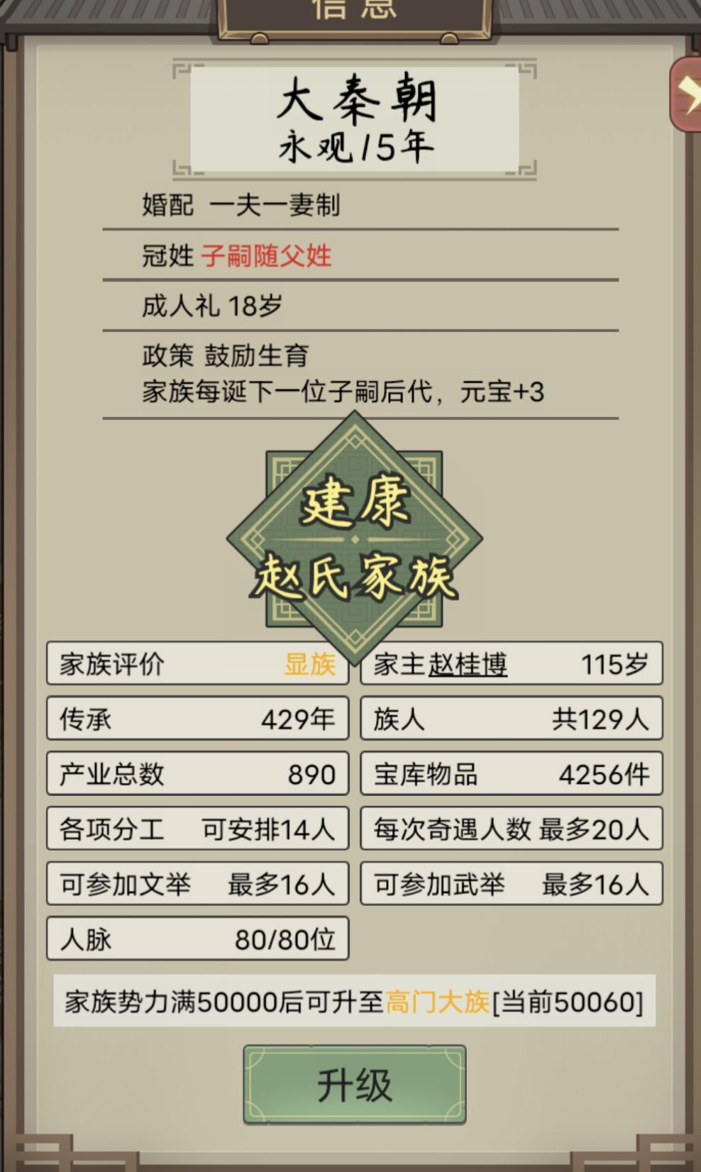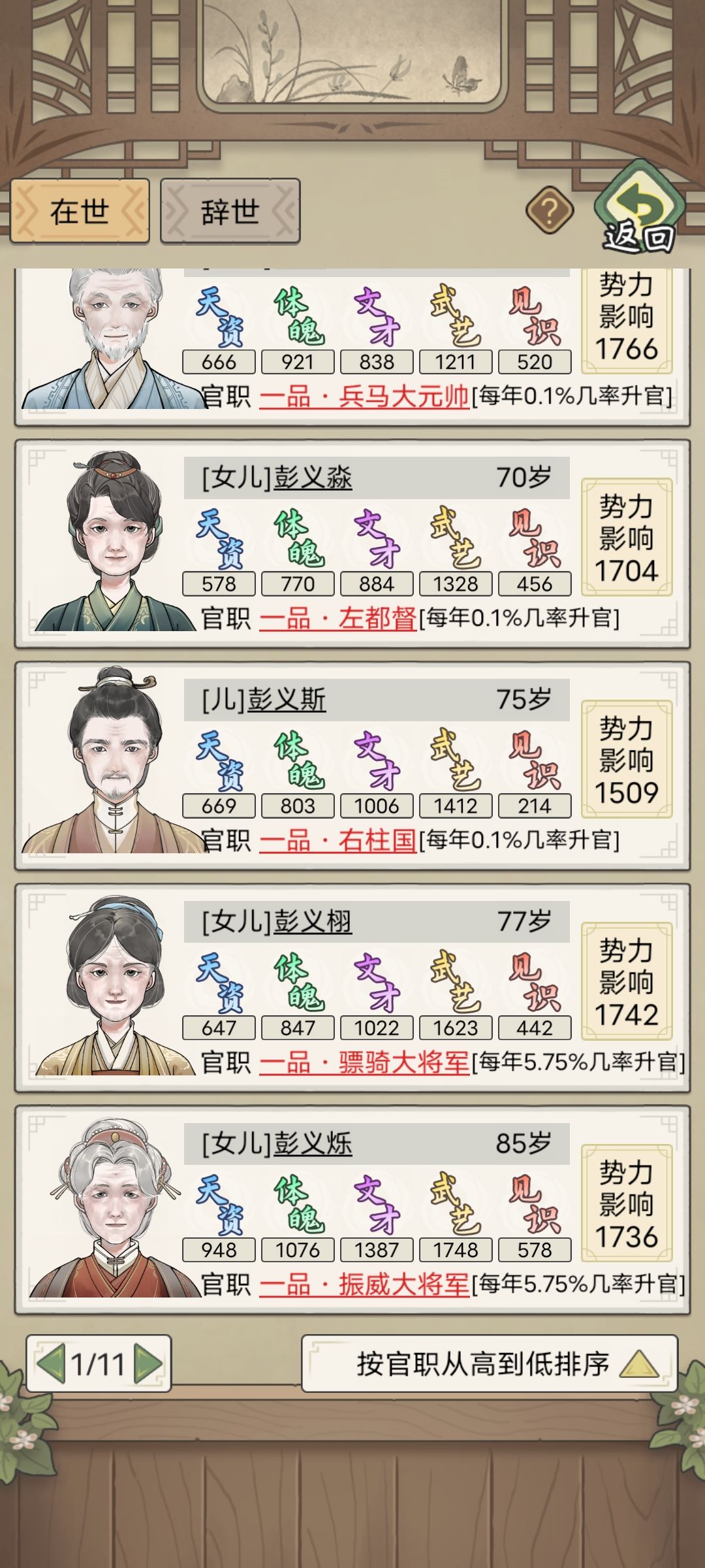 几世才供出来一个皇后[表情_叹气] 从二品到皇后花了十多年,还不能留下后代 武官升级就轻轻松松 46岁速成一品,家里一排高品武官 —— 非要玩的话 1. 压制家族人口,适龄的不急着结婚,让秀女尽可能多地吃到人脉的属性提升; 2. 人脉优先选增加见识的; 3. 秀女的文才和体魄保持100+,才能参加+见识的两个分工(80岁以后就不能参加远行了,尽可能在这之前把见识拉到1k5以上); 4. 选秀前可以