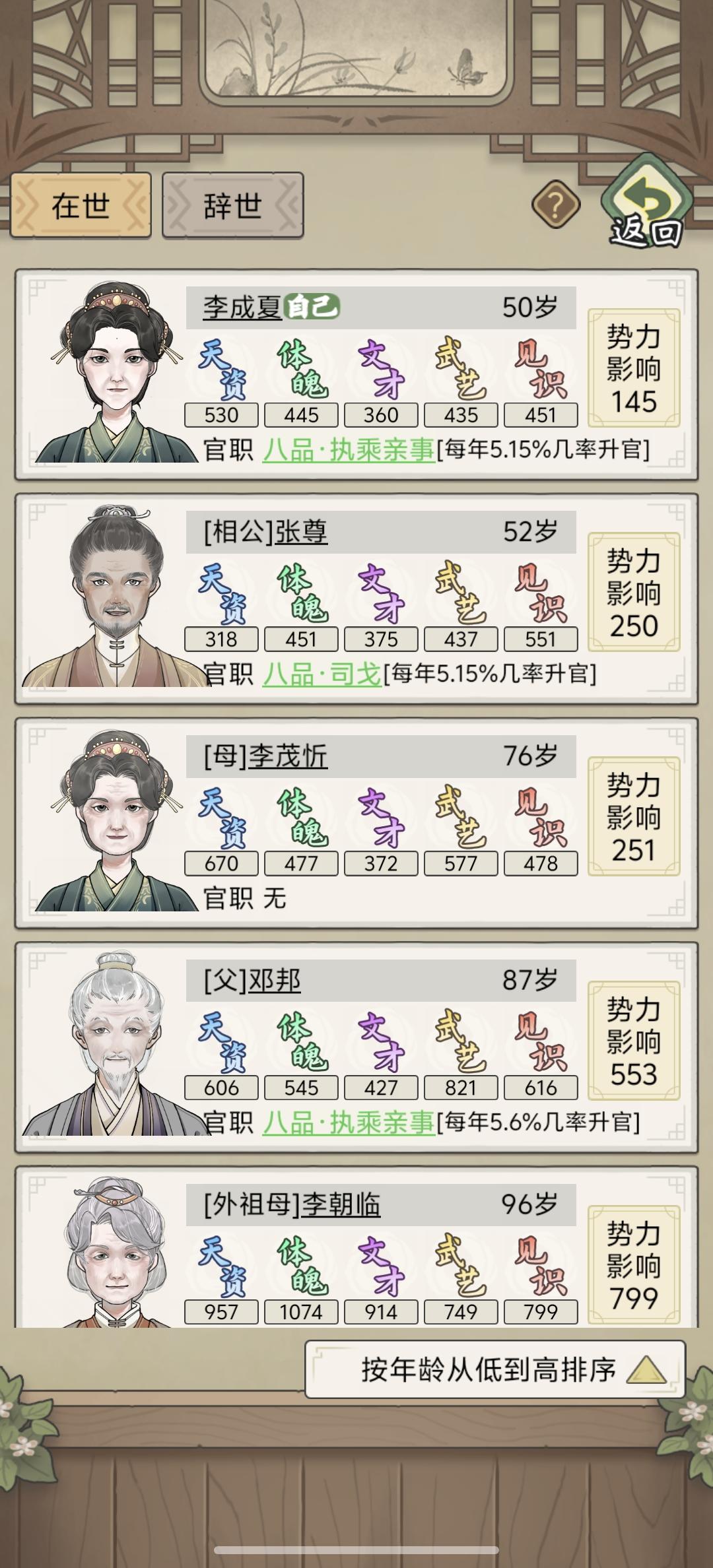 1、游戏得让玩家爽,没有什么比当皇帝爽了,加个造反吧,当个一品有什么用?2、古代做官就基本没有退休的说法,建议官位留到死3、太多不想要的后代了,得加一个入赘或者出嫁的送走,不然玩着又累又乱。4、请加大难度