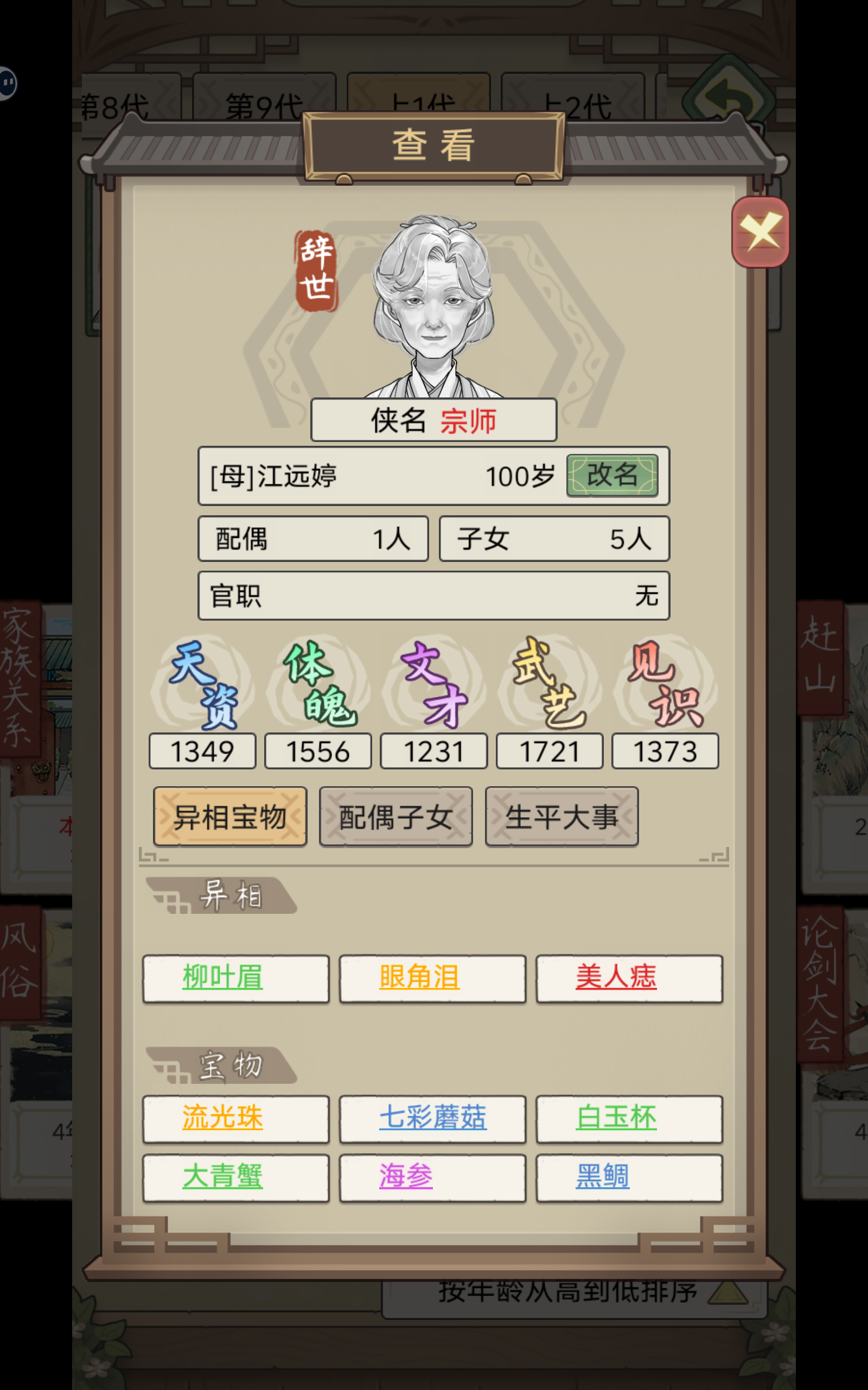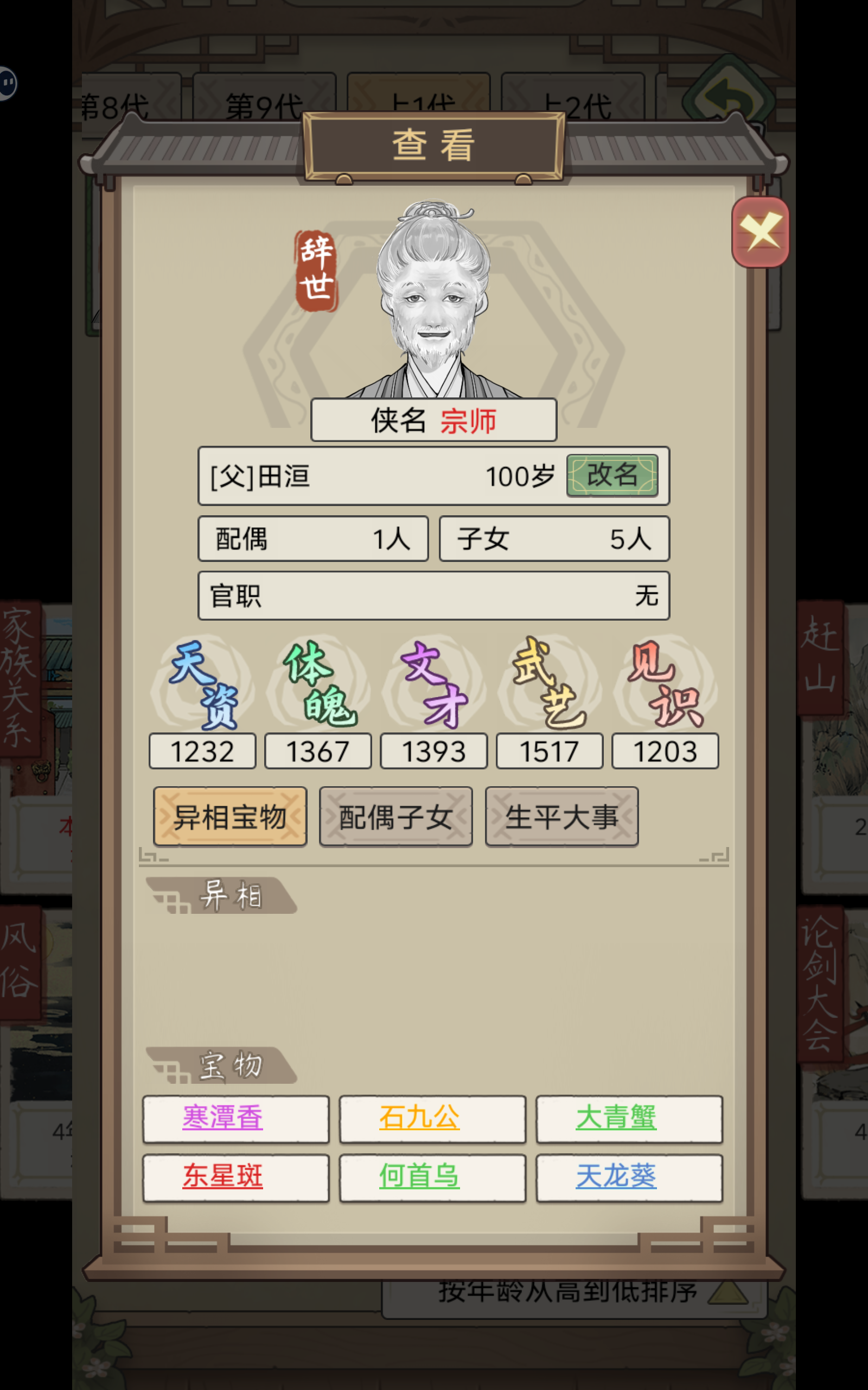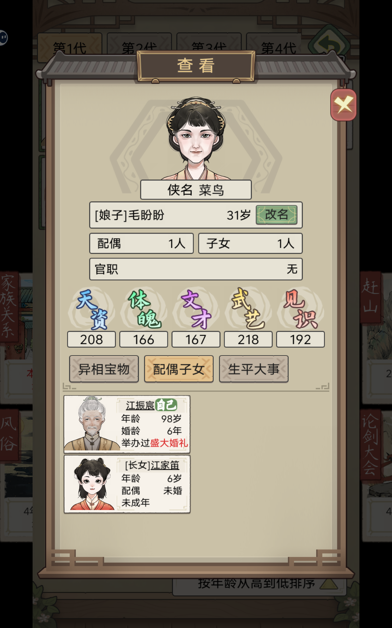 不知道为什么家族里,每个家主100岁必定嘎。之前选的妻子年龄太大了,先嘎一步,重新娶了一个新的,没想到第二年就生了一个,天赋还不错。不过我心中早有家主人选,希望能设置一个家主还能再再选择带一点其他旁系的人选。心痛,过两年之后放弃这个女儿了