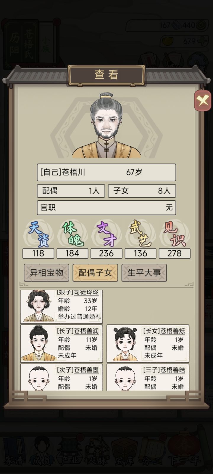1、游戏得让玩家爽,没有什么比当皇帝爽了,加个造反吧,当个一品有什么用?2、古代做官就基本没有退休的说法,建议官位留到死3、太多不想要的后代了,得加一个入赘或者出嫁的送走,不然玩着又累又乱。4、请加大难度