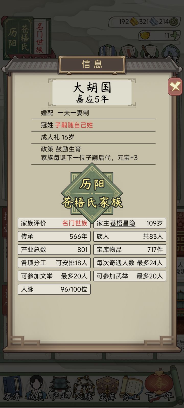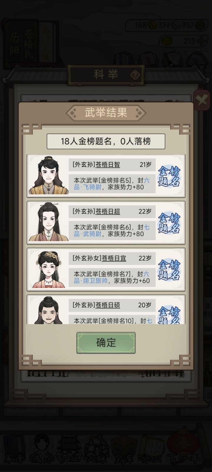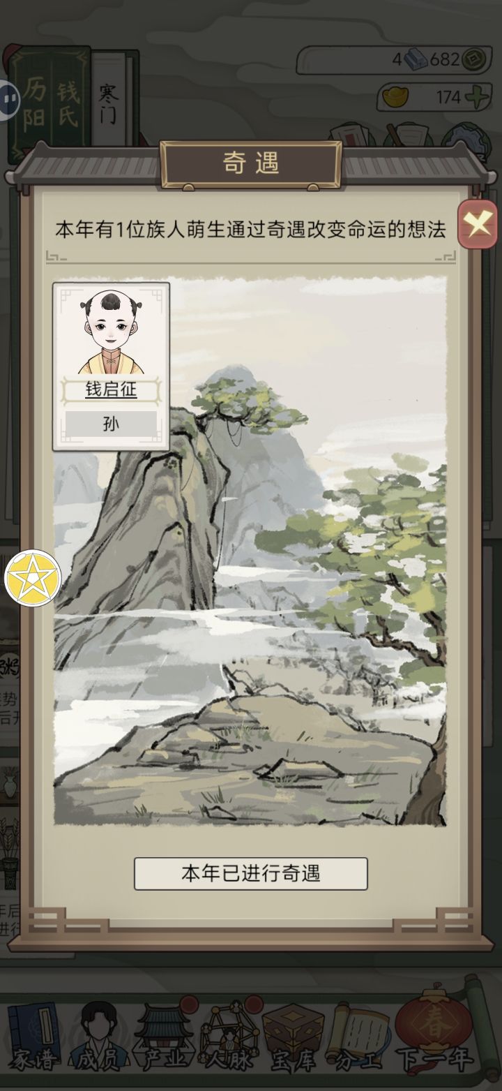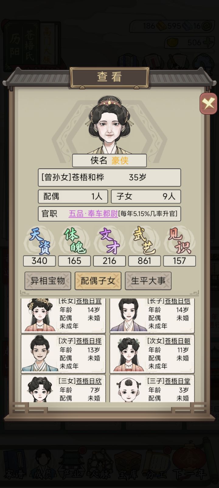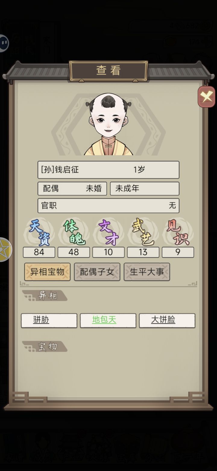 曾经还遇到过“六喜临门”的来着可惜没截图唉。。。现在不咋玩这个的,主要是不大爽家主永远最高在81岁圆寂这个设定(当然也和我选的主线有关——16成人+每生一胎奖3元宝)