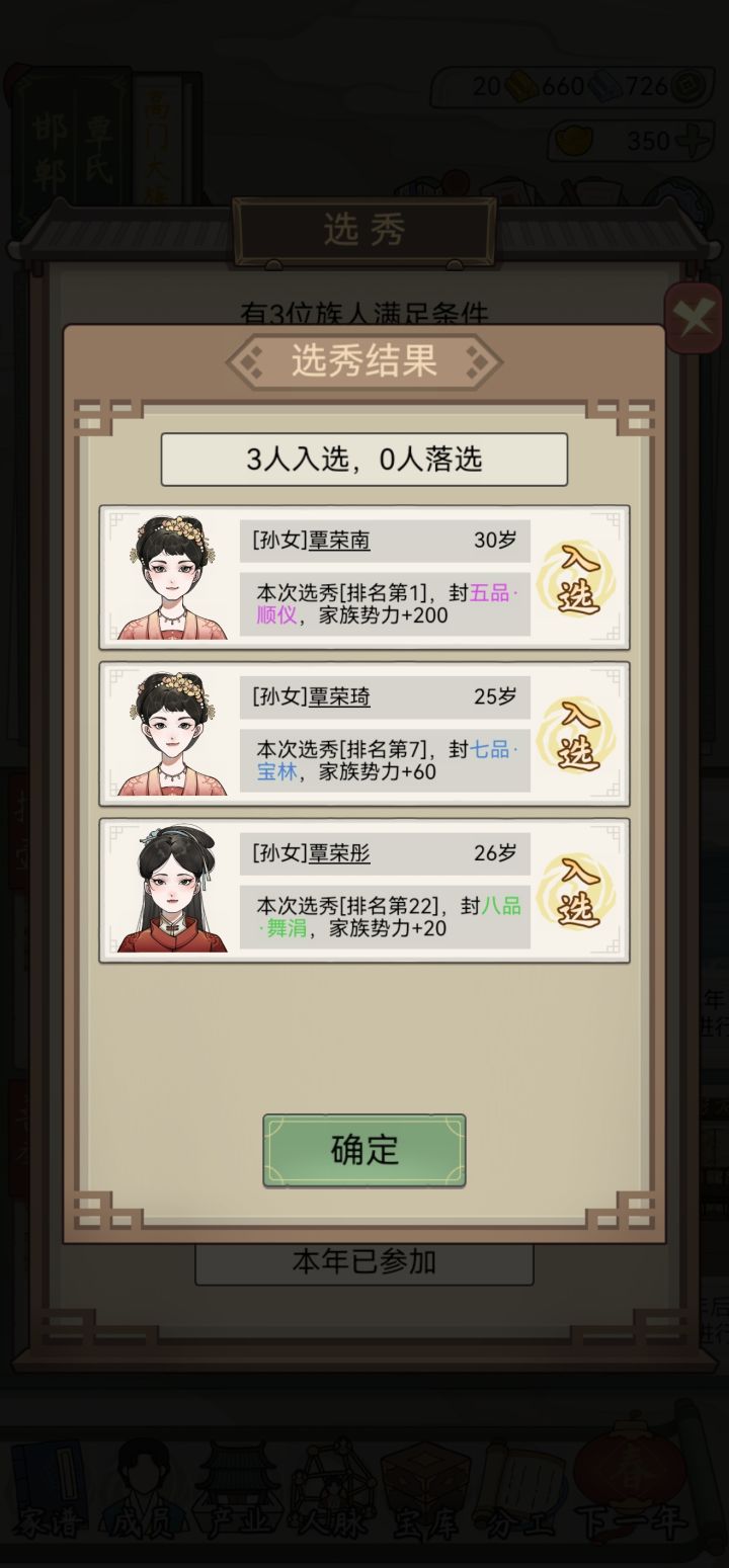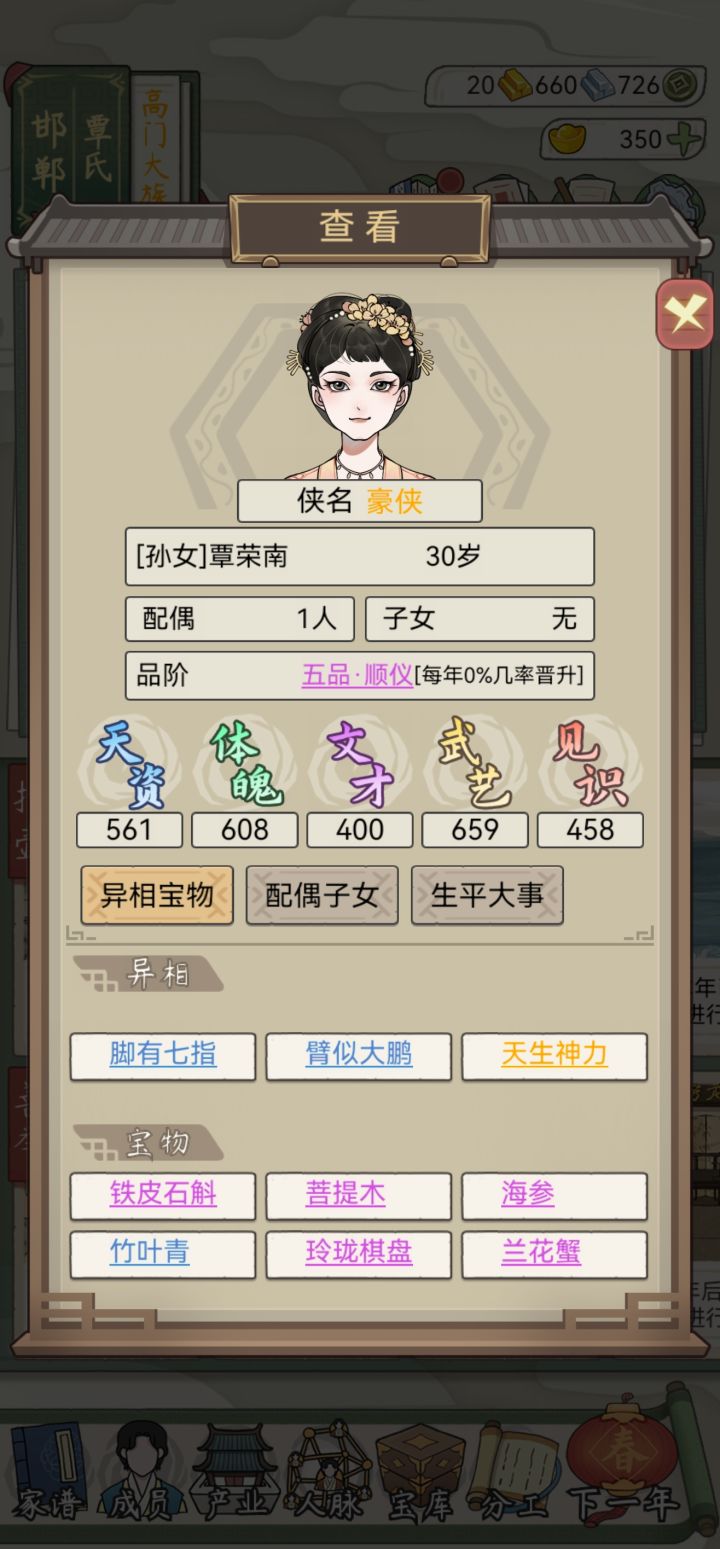 先来说几个重要的点数,天资,生孩子多不多主要看天资,然后就是体魄,体魄低的容易没,文武两个都是当官用的,见识是选秀用的,前期缺钱的时候,少生孩子,天资不重要,堆文武送去当官,有钱了就要天资,天资高生孩子多,元宝多,后面氏族升级全靠元宝。当官怎么当,开启科举之后,排名100以内就能当官了,当官挺迷的,我文武双1000的时候,第5名给个七品,但是也有文武双500的时候给状元的,所以总结下来就是,能参