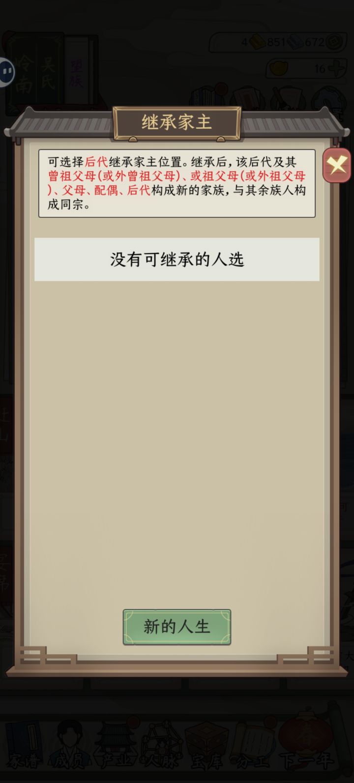 这游戏设计也太扯淡了,将家业继承给进宫选秀的女儿后,女儿都已经当上皇后了,却没有子嗣,没有子嗣就算了,后续死掉之后居然还不能从家族当中任选一位继承人来继承,导致我偌大的家产只能重新开始新的人生。痛!太痛了!就不能优化一下吗?都当上皇后了居然还没有至高无上的权利吗?姑且不论皇后她是否有子嗣,好歹咱也是皇亲国戚,让我后续从族人挑一个能继承的怎么了?这简直就是大大的系统bug!!!