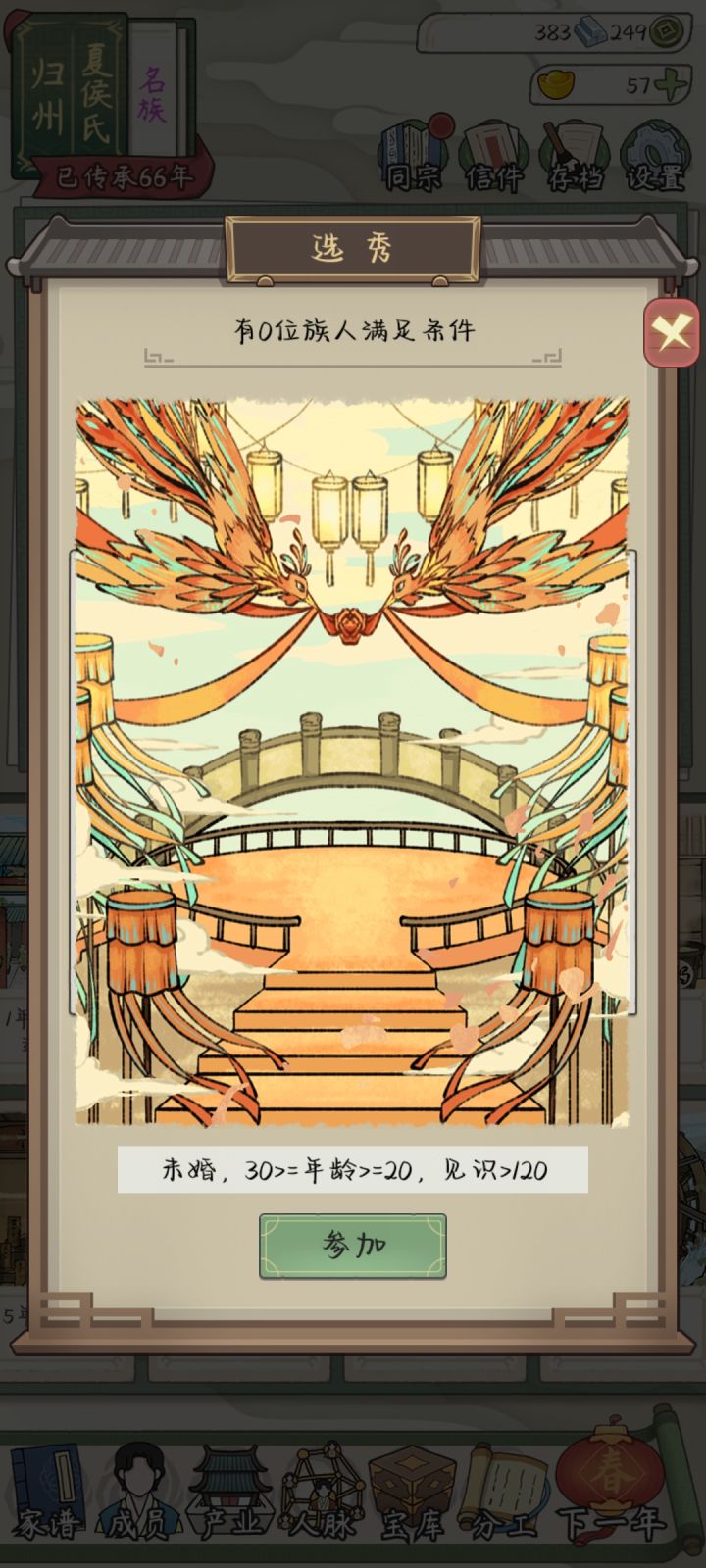 玩几个小时就会腻的游戏,不理解为啥选秀成功了却没有孩子,生个皇子不好嘛哈哈。腻了后想看选没有孩子的继承结果会怎么样,结果就是没有继承人,只能重新开始喽哈哈哈