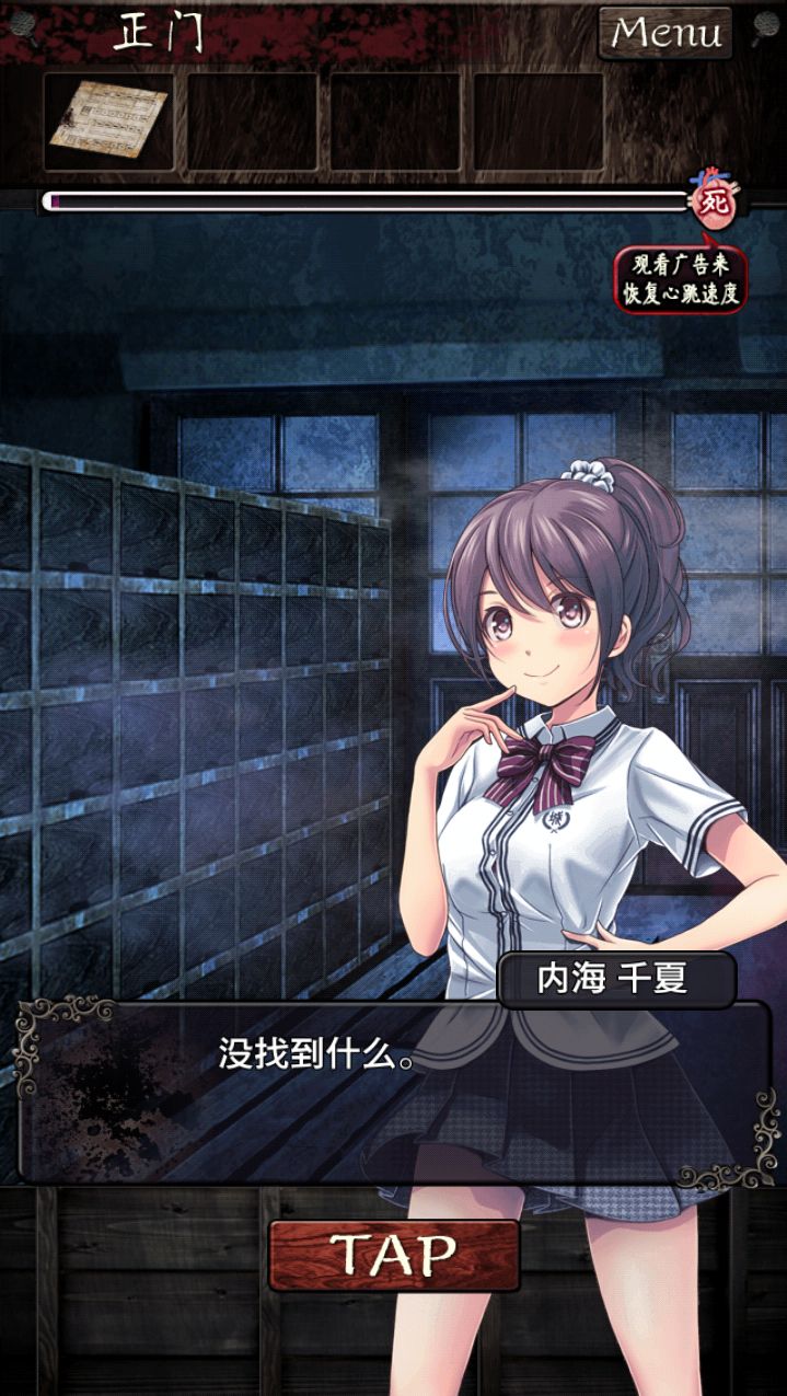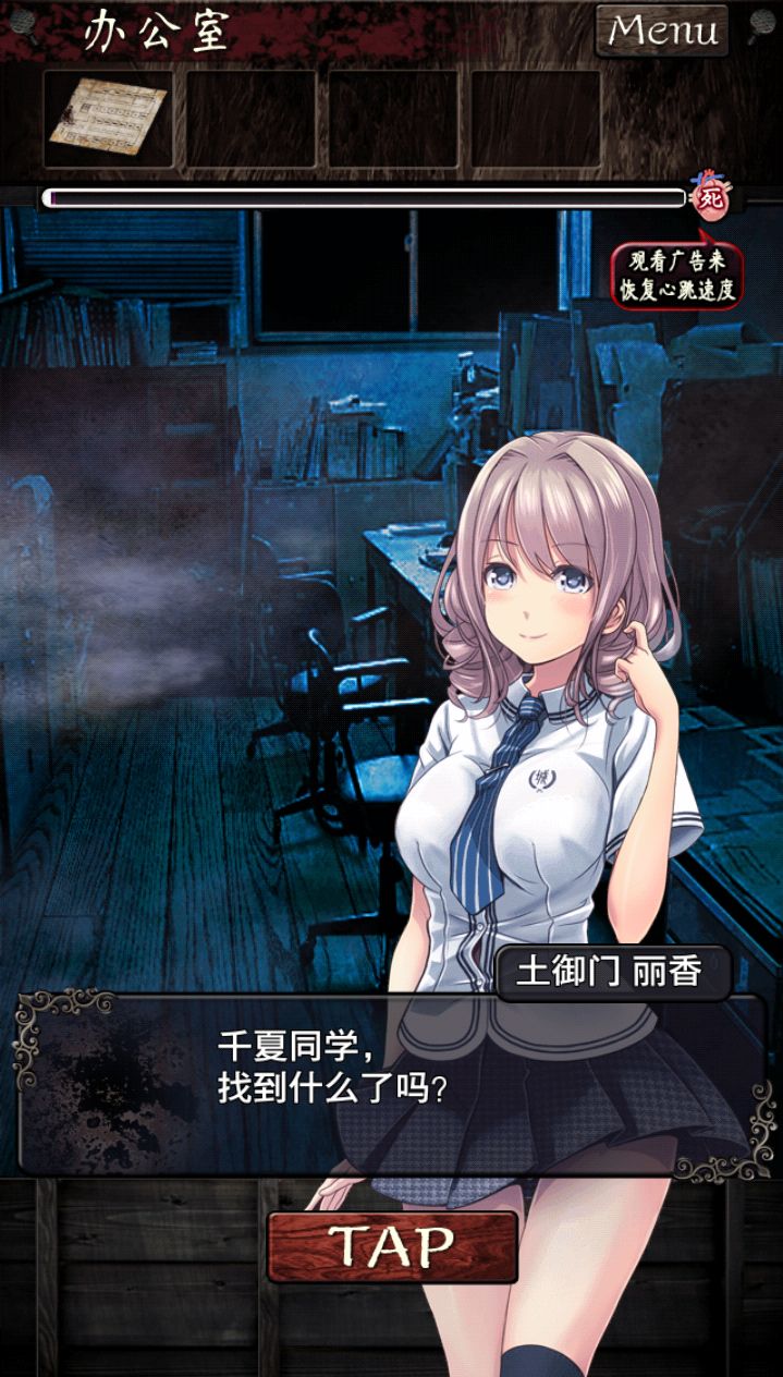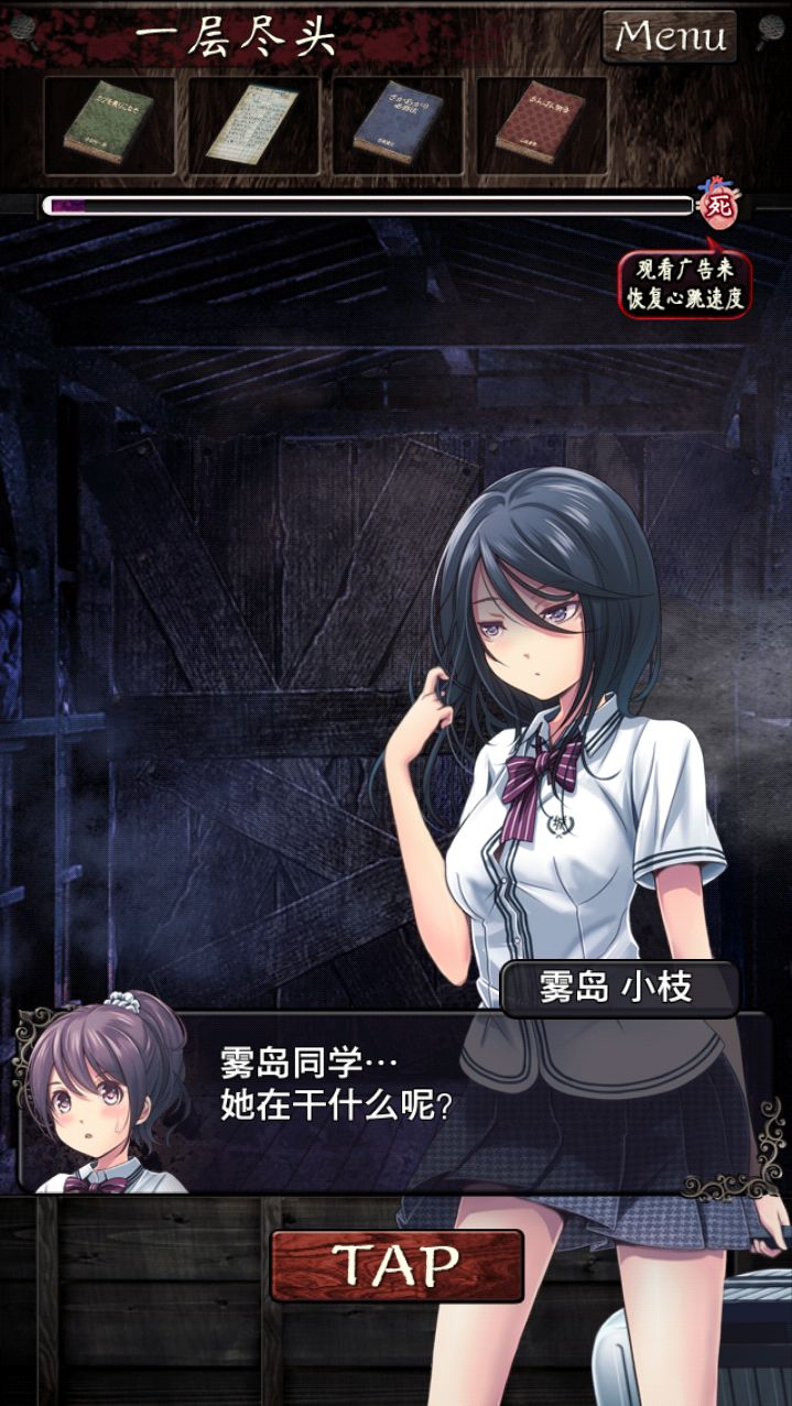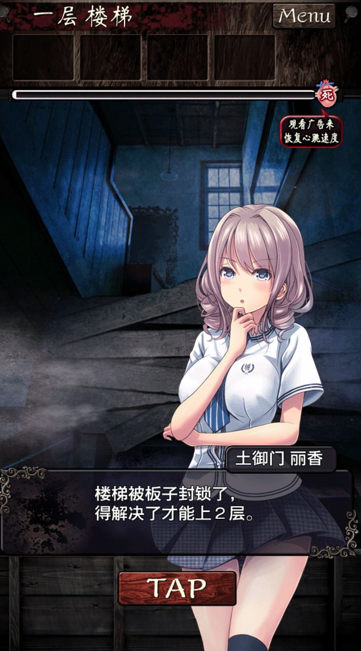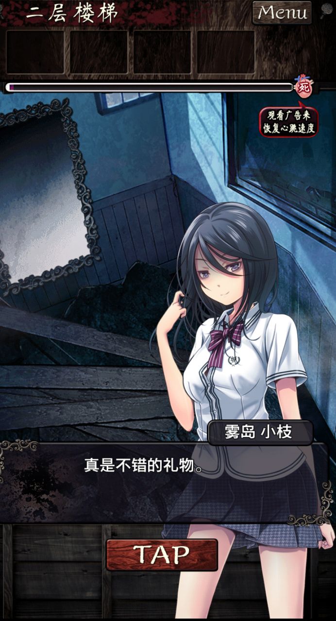 Menu是游戏设置菜单。进度条上的心脏死字代表女主的惊吓值,当红色进度条到达死就是重新玩,点回到标题画面也要重玩。游戏系统没有自动保存。