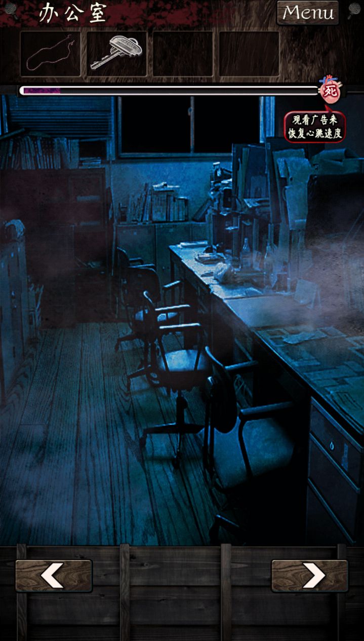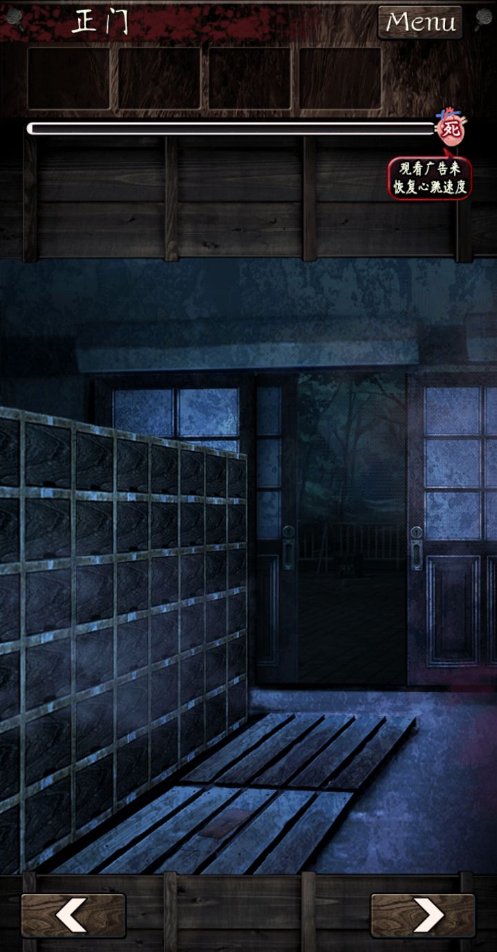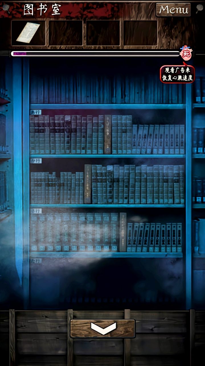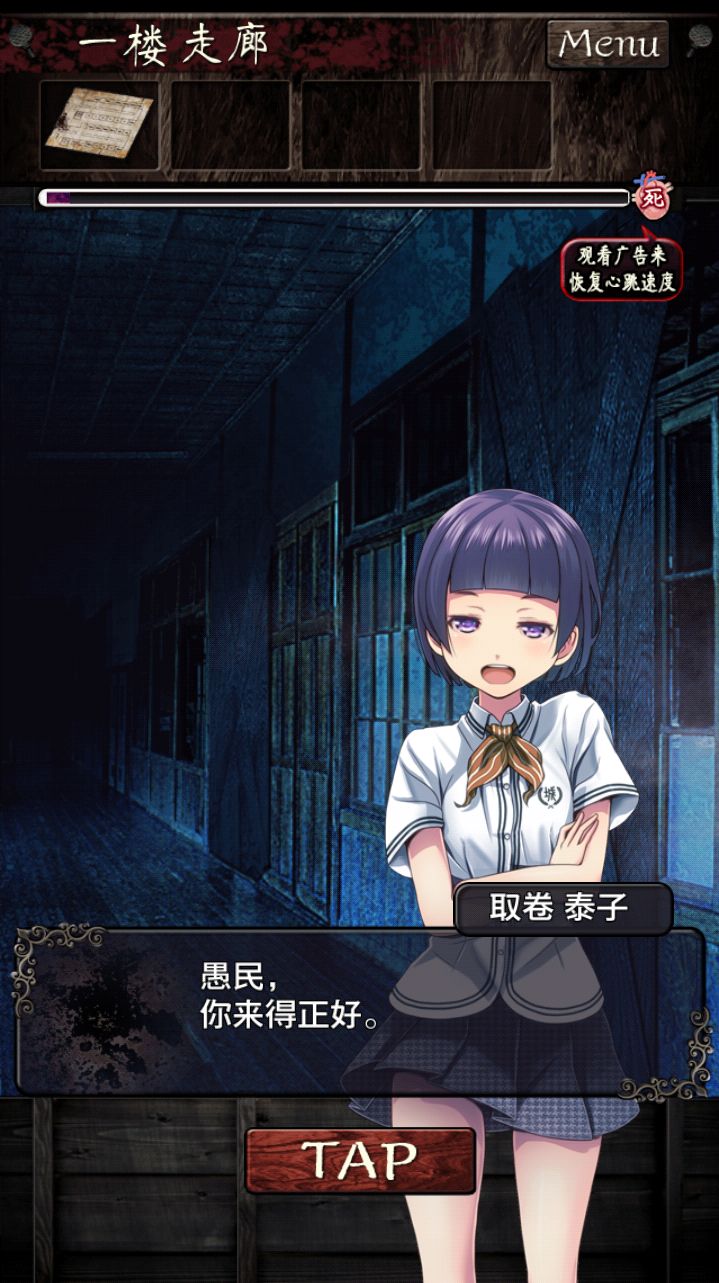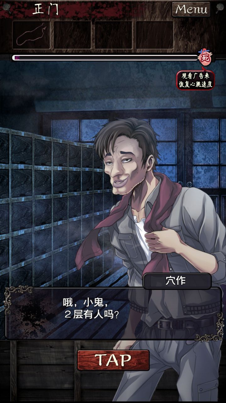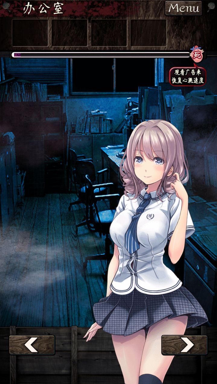 Menu是游戏设置菜单。进度条上的心脏死字代表女主的惊吓值,当红色进度条到达死就是重新玩,点回到标题画面也要重玩。游戏系统没有自动保存。