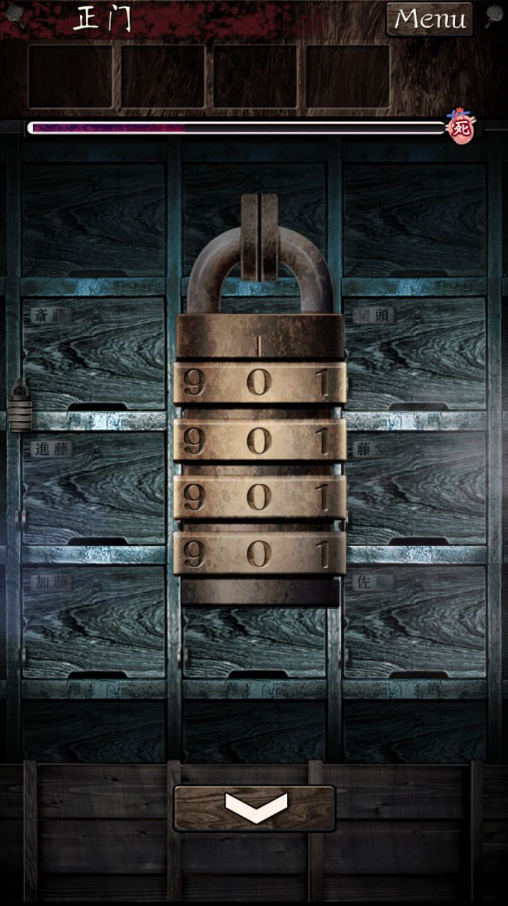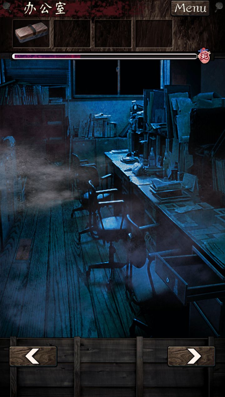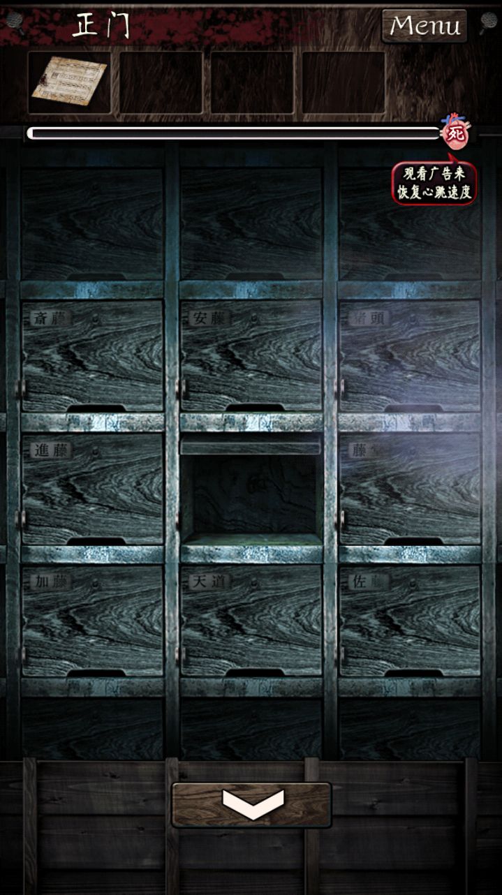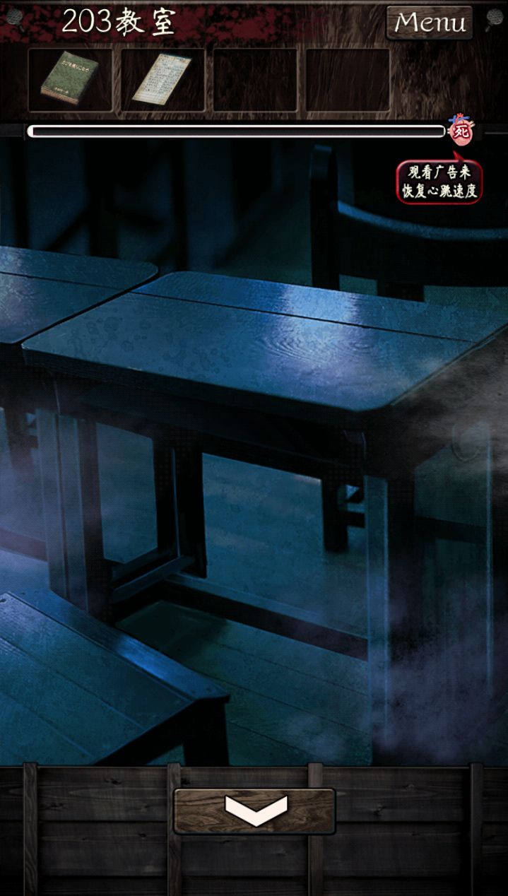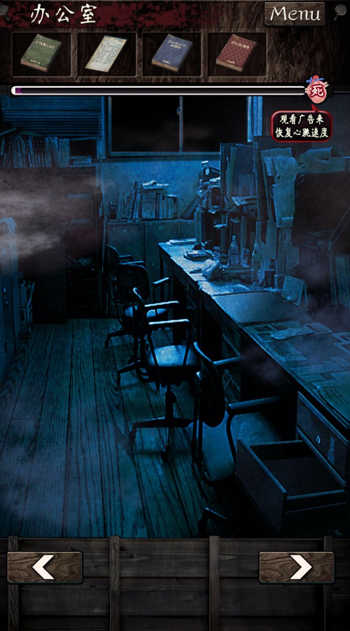 Menu是游戏设置菜单。进度条上的心脏死字代表女主的惊吓值,当红色进度条到达死就是重新玩,点回到标题画面也要重玩。游戏系统没有自动保存。
