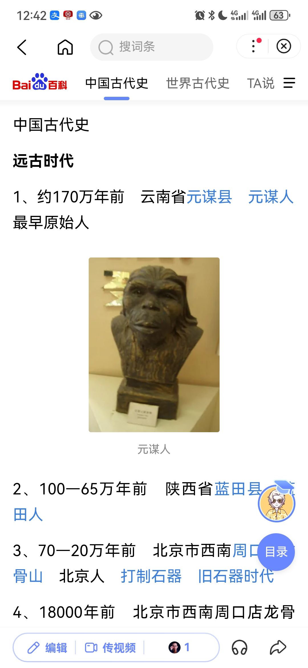 1、约170万年前 云南省元谋县 元谋人 最早原始人 元谋人 2、100—65万年前 陕西省蓝田县 蓝田人 3、70—20万年前 北京市西南周口店龙骨山 北京人 打制石器 旧石器时代 4、18000年前 北京市西南周口店龙骨山山顶洞山顶洞人 磨制石器人工取火母系氏族
