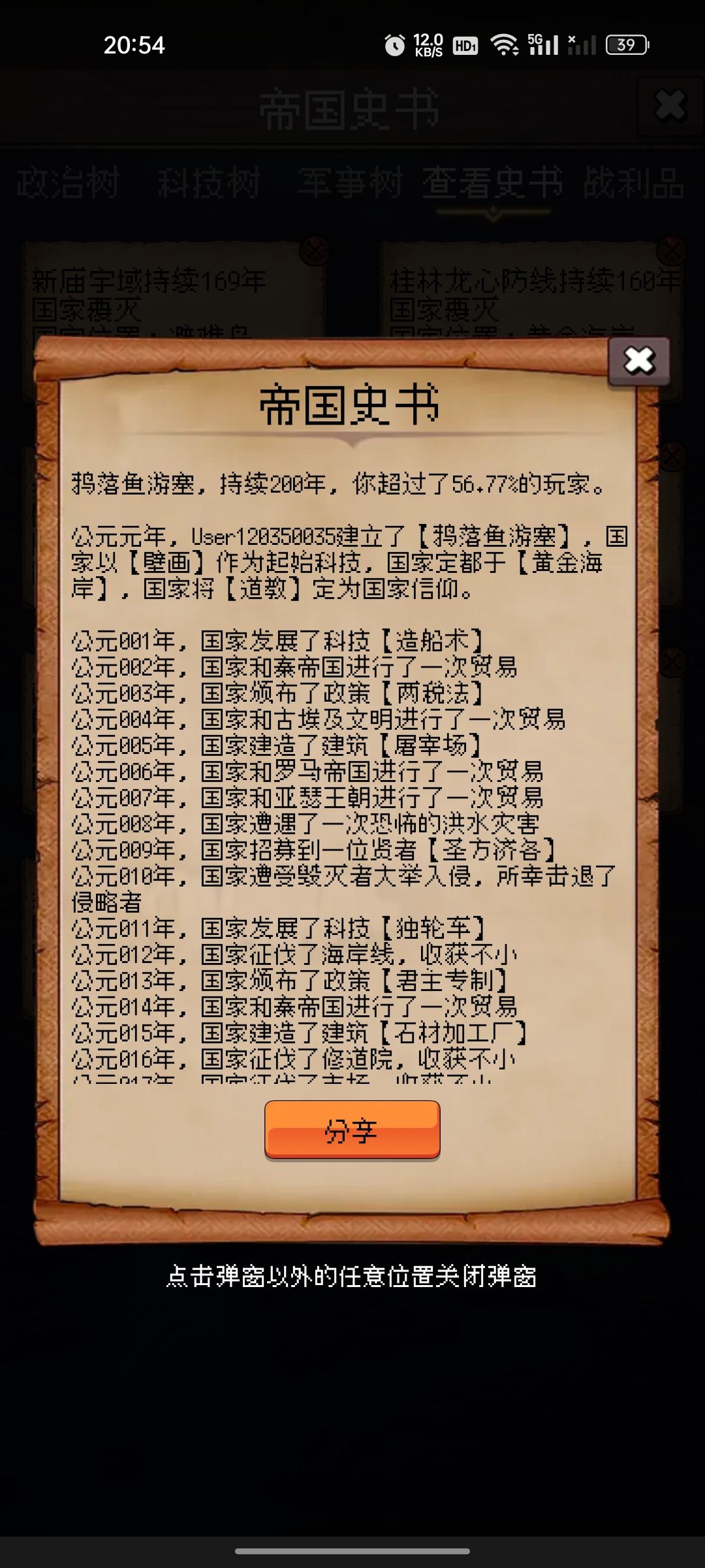 鸦落鱼游塞,持续200年,你超过了56.77%的玩家。 公元元年,User120350035建立了【鸦落鱼游塞】,国家以【壁画】作为起始科技,国家定都于【黄金海岸】,国家将【道教】定为国家信仰。 公元001年,国家发展了科技【造船术】 公元002年,国家和秦帝国进行了一次贸易 公元003年,国家颁布了政策【两税法】 公元004年,国家和古埃及文明进行了一次贸易 公元005年,国家建造了建筑【屠宰场