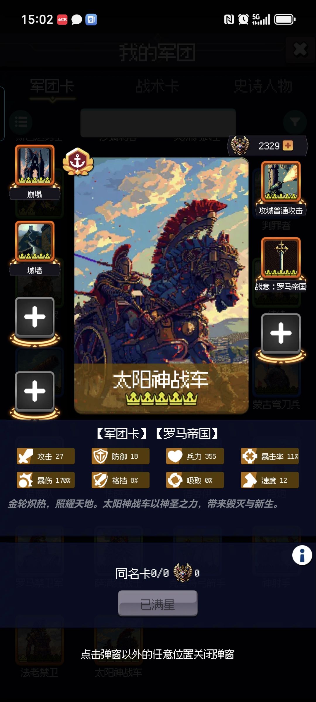 不氪或小氪,太阳神战车出奇的好用。竞技场可以稳定换到5星。带上古阵大师和两张古阵,不但硬,输出还稳定。