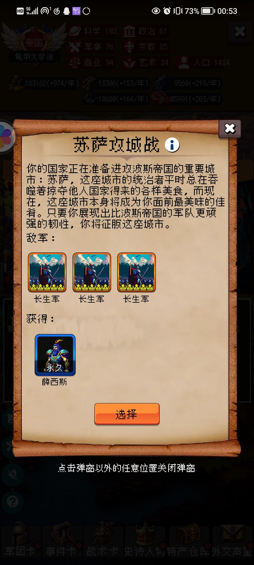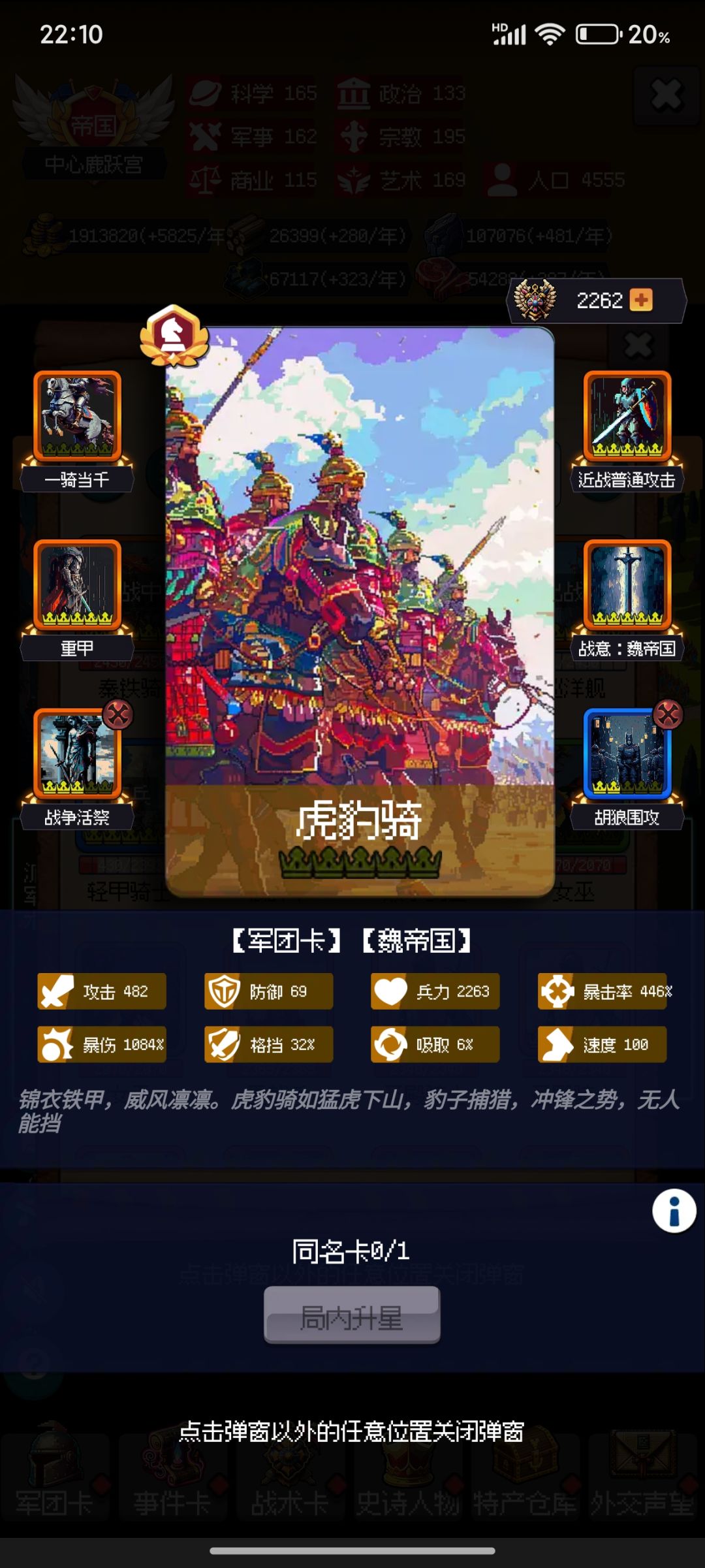 需求不高,氪金到刷一星玄甲军就可。 然后自己每次到211年结算,可以获得随机蓝卡,利用手机自带备份,去刷16张手术医师。 开局政策选择,每次逢2年可以用手机备份存档一下,SL大法节约时间。 兵种技能跟政策选择看图,图中是990年的属性。下面是好用的政策,不是很全,我没有反复刷新测试。 33 尚武 30年+4攻 43 军事传统 每次学院 骑兵爆伤6% 53 挟天子 每十年和谈 防御+1 63 封建主