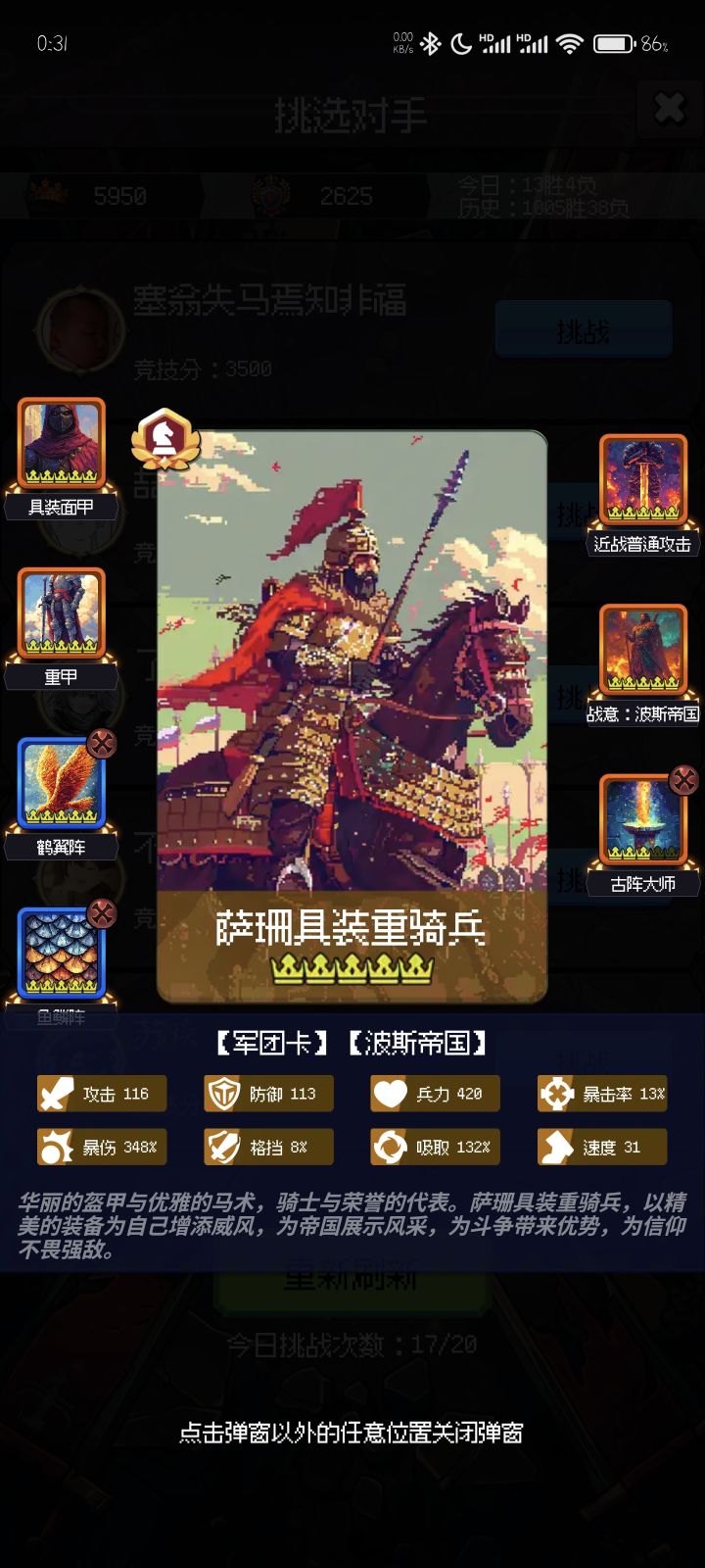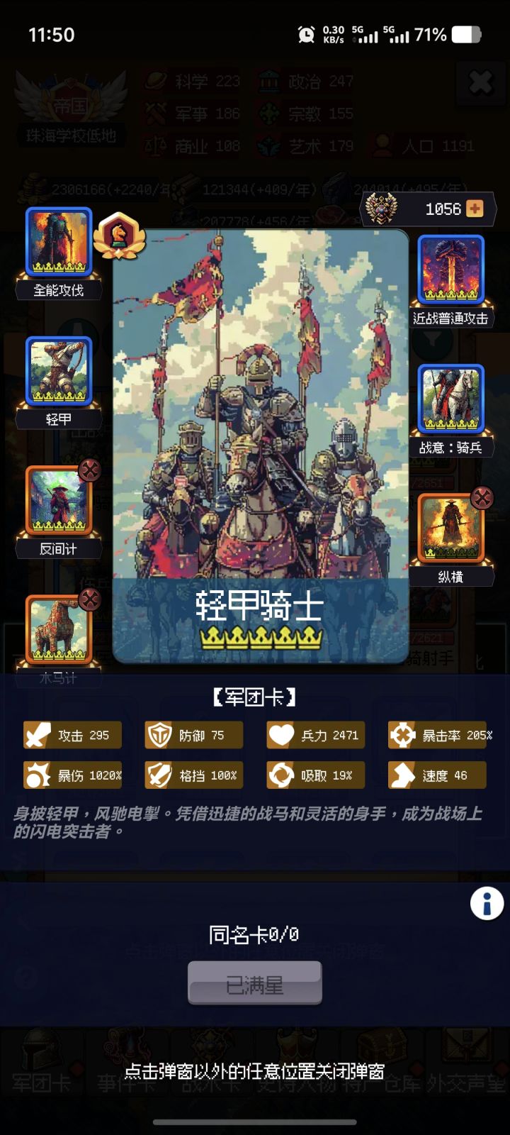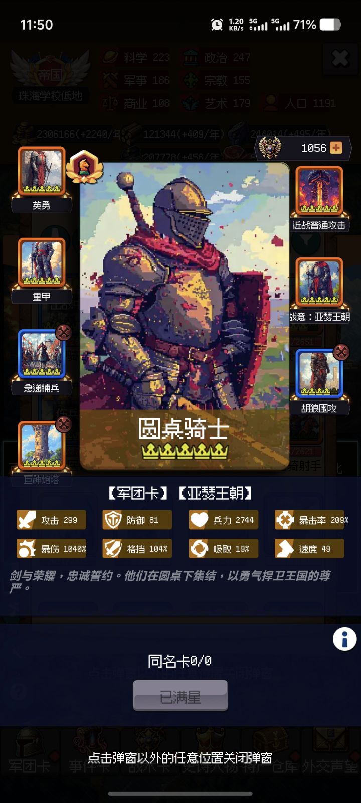 只有骑兵队伍能稳定破格挡,氪一个斯巴达城邦,需要点些史书,叠格挡和暴击伤害,撑到400回合左右,后面就无限循环了