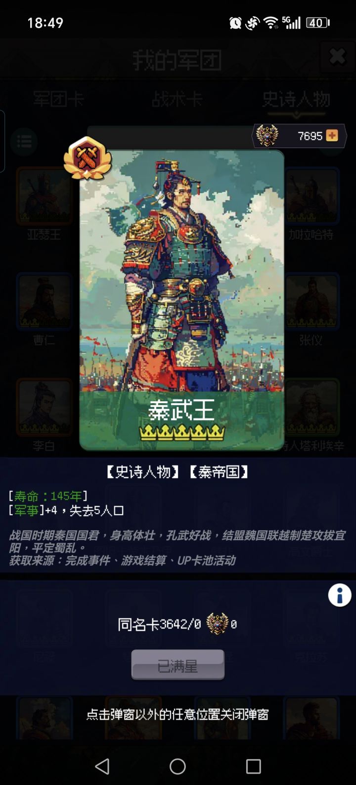 我是第五天完成通关的,很遗憾没有诸葛亮,通关主要依靠刷档法(1),刷档法(2),哥伦布,帝释天,柏拉图。我会从零氪萌新和微氪萌新视角讲述简易通关要领刷档法(1):tap端目前常用sl法,准备阶段选卡界面关闭史诗人物自动启用(即使不sl,也建议关掉)。开局启用获取政策,地理,建筑,科技卡的史诗人物,由于获取的这些卡不会立即启用,所以暂时保存退出(第一年不会系统不会存档,即使系统说自动存档也是虚的)