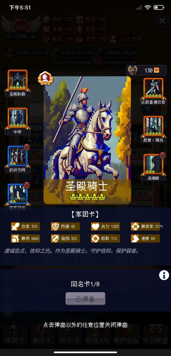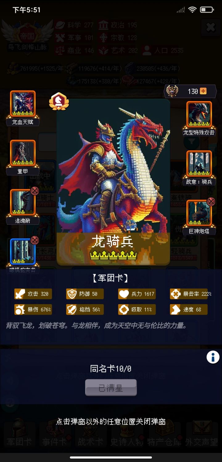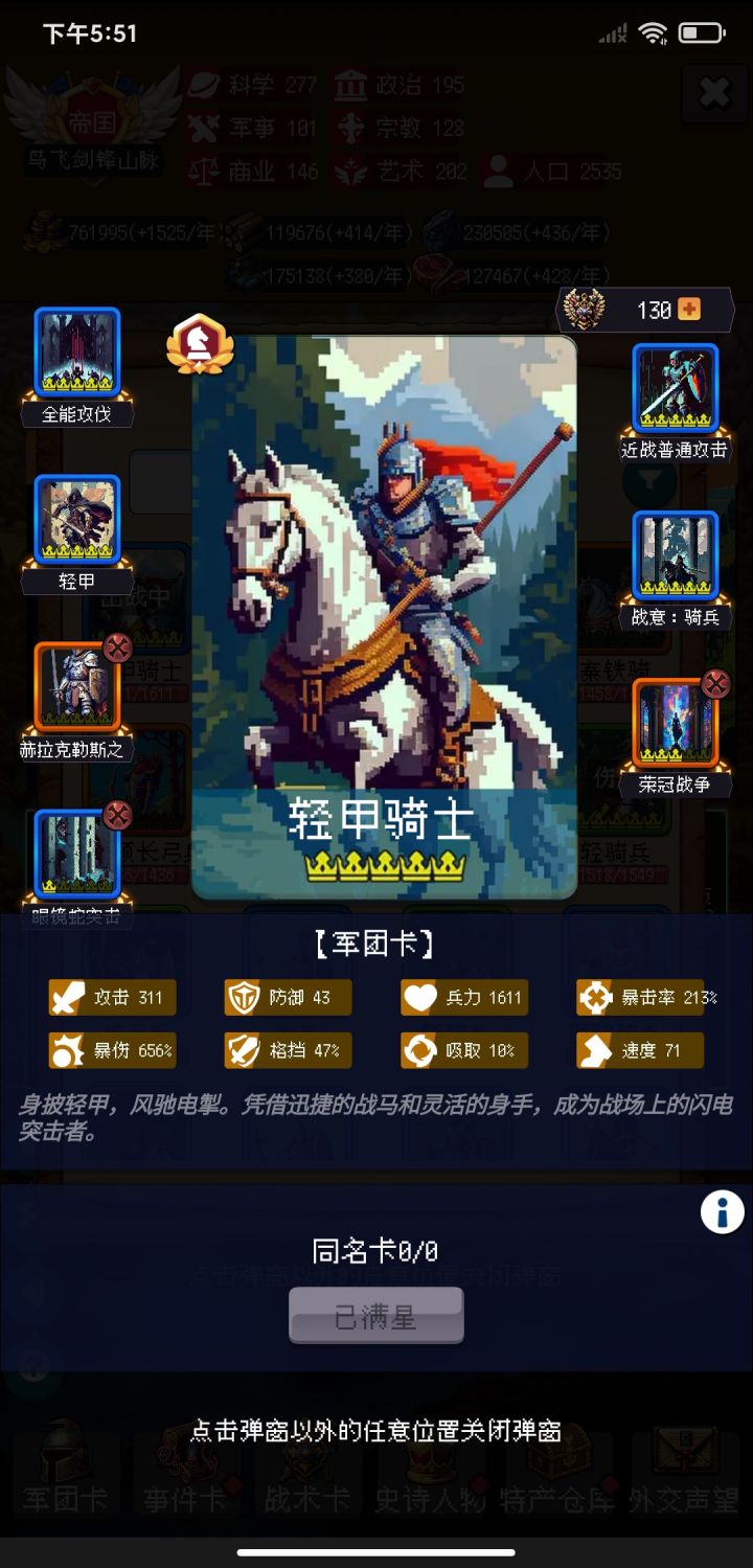 结尾我放六维的,重要政策需要的属性图我连斯巴达都没买,通关的话西班牙去掉就行。秦国,古埃及,亚瑟先放一张五星龙骑士,证明一下我的实力。四星橙卡三个战术,蓝卡五星3个战术。我们们首先我们先来说一下,成长型政策。其他政策就不是非常重要。骑兵速度一定要选骑士主要是:33年的每次学院加6%爆伤,273年的军功爵每次战斗加1骑兵伤害,1%的暴击。55政治(军事基本溢出,要55点军事)步兵的话93