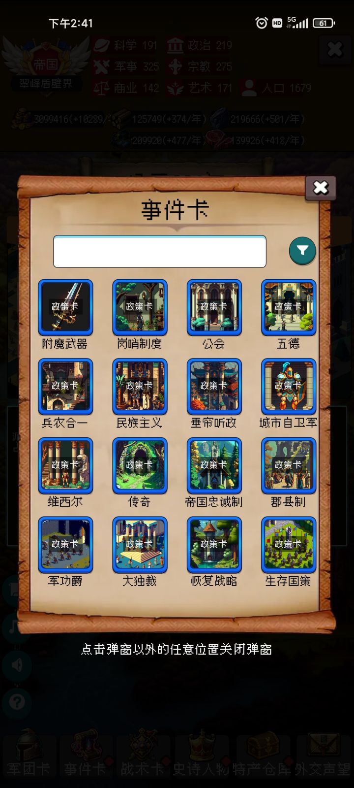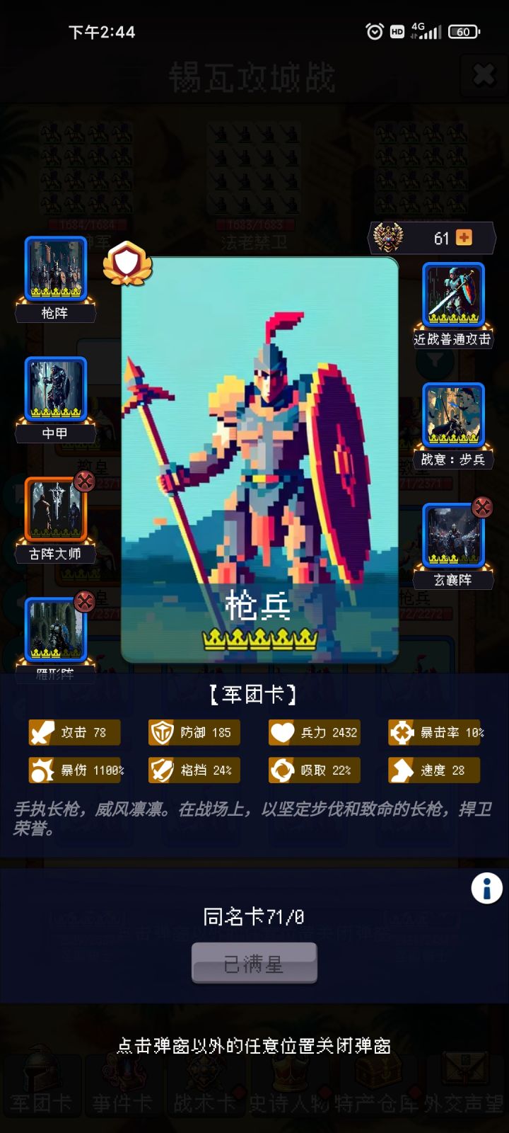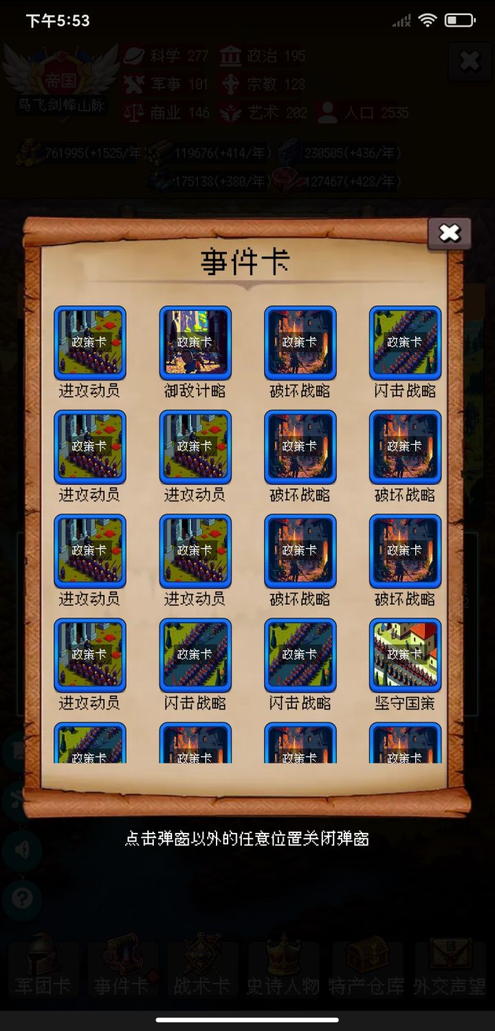 技巧比较多首先就是去领福利,更多里面都拿了1.史书加点新手重点是科技树,前两列属性点和资源都点一下,基本上前期随便打了其次政治树,步兵点到3,第一列点两个,剩下的军事树点步兵(所以新手要以步兵为主)2.商店主要是战术卡,优先回血的卡比如眼镜蛇(即能补充兵力的卡),注意丰产仪式要搭配“灵”,所以遇见要买一张,其次就是进攻的卡,各种反击或者全体伤害知识卡刷完了就是军团卡,这个同样优先回血
