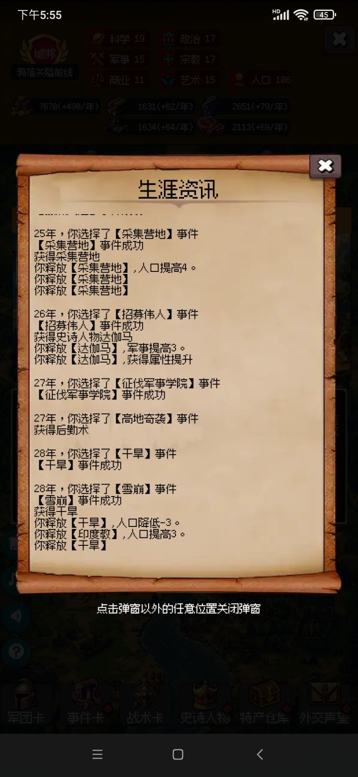 是不是只有医师只有0级自带眼镜蛇只有一级就通不了啊,我从上到下一点一点的尽最大可能满足攻略要求但是到了三百多年好乏力,好不容易凑齐了所有要的关键政策关键卡打了关键战役,三百多的关怪都太强了就算兵力到了八九百也很乏力甚至好多时候都打不过,战术也是按说的这么带的还是打不过三百多关的好多遭遇和战役,我打到320多年再抵抗失败一波就输了所以我又回档到选军功爵的时候,白天专门刷好了关键政策关键科技还以为晚上继续按照攻略打就能过了结果还是打不过气的我睡不着