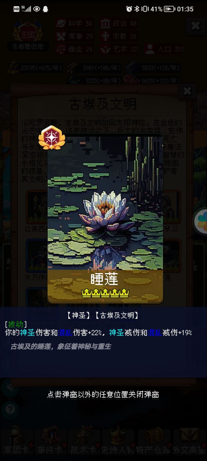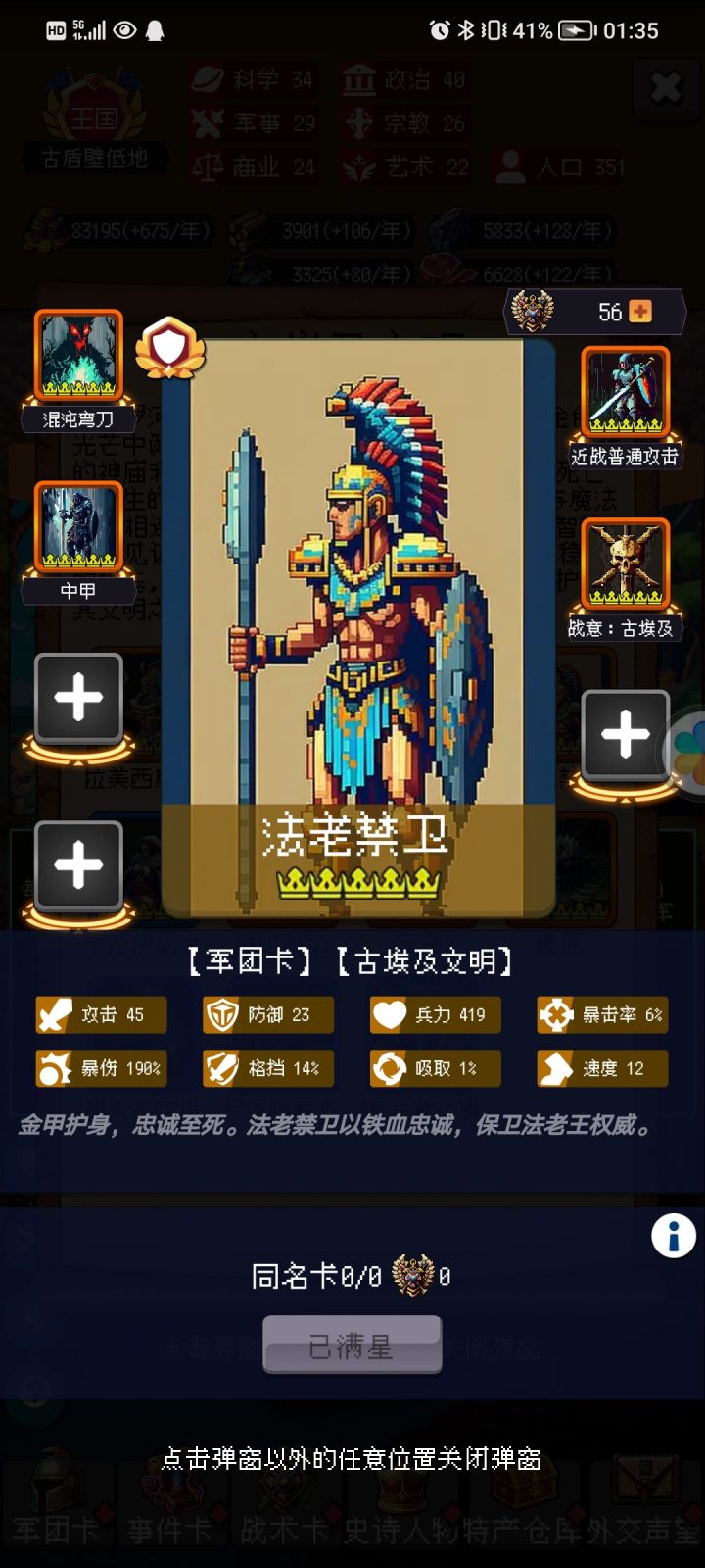 前言:古埃及做为开服时期元老卡包,目前做为免费基础包,内含的功能性很强,不论是奇观金字塔还是政策维西尔都是相当值得一选的政策和奇观。.素材纯属手打,给辛苦的作者点个赞吧👍. ———————正文———————入局体验:敌人:主要的敌人由骑兵、步兵、神职类型的组成。政策体系:通用政策、器械为主弓兵为辅,艺术宗教属性政策比较多,可以作为神职队卡包或骑兵队的补充卡包。.特产:亚麻布。战