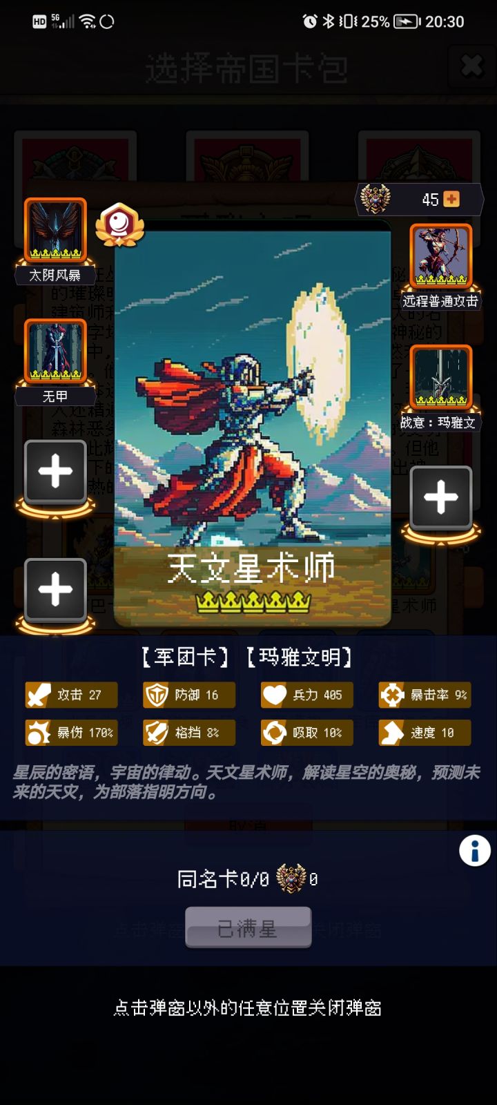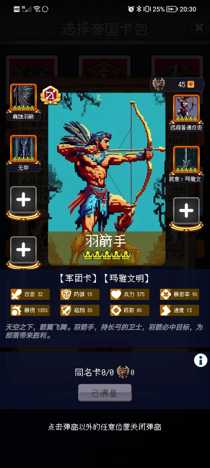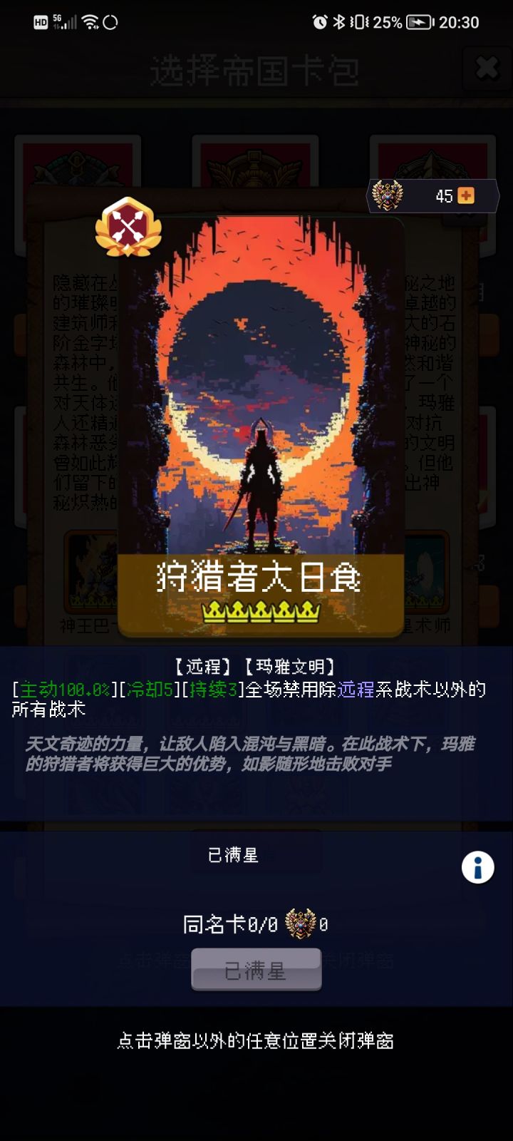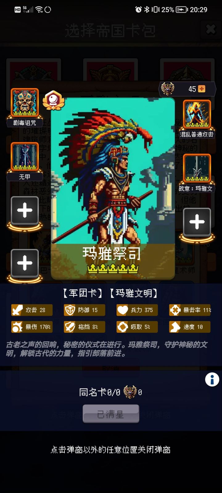叠甲:个人评价体验,氪金与否纯看个人。看在作者辛苦的份上,希望大家给个免费的赞👍.加入卡包后对局体验:.政策卡主要提供弓职、神职加成,如果玩这个体系的话建议购入卡包,国家属性得分遥遥领先(每次玛雅贸易、文化交流都涨宗教属性)相当给力。.玛雅敌军:中后期遇见赶快跑,尤其是攻城战,主打一个激情互秒,(强力的卡牌往往伴随着风险.JPG),200年之后你要是是跑不过他,两回合下来基本就崩盘了,