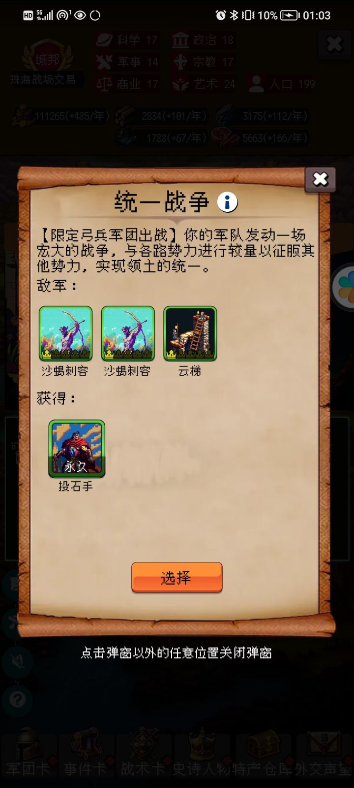 33年-53年 招贤纳士 :每次招募事件额外获得一个绿色史诗人物保甲法* *:每次发展事件步兵爆伤+5%以战养战:每次战斗事件粮食+12063年-83年 焚书坑儒* :失去一个神职军团,获得一个蓝色步兵军团,步兵军团攻击+8十一抽杀律*:人口-11,步兵攻击+693年-113年 执行官**(19政治 19商业):每次谈判步兵暴击+1%,暴击伤害+3%停战协议**(19政治 19军