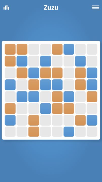 你的游戏目标是使用唯一合乎逻辑的决定来填充棋盘,和数独游戏类似。点击棋盘上的方块可以设定或更改它的颜色。和通用的二级制数字系统相似,只有两种颜色的方块,红色(0)和蓝色(1)。Zuzu游戏开始时是一个未完成的网格,你必须根据下方列举的三个规则来填充这个网格。