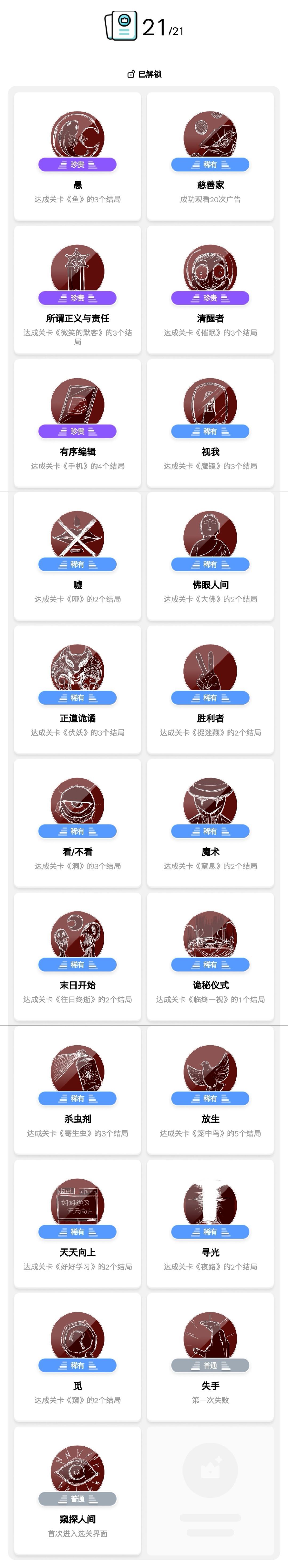 除了一个需要看视频的成就,其他成就只需要按照攻略完成即可。 画面制作很良心,刚开始玩的时候害怕经常会碰到一些恐怖的地方,但是越到后面越不害怕,甚至感觉到一种唏嘘…… 大佛这一关在同一个场景下展现了历朝历代的服饰变化,从隋朝到民国,从东方到西方,当看到那一抹鲜艳的红领巾真的忍不住泪目…… 通关不难,但是很多游戏都很有意思,最大的乐趣还是通关之后观看游戏的后记,虽然有时候游戏会有很多结局,但是不同的结