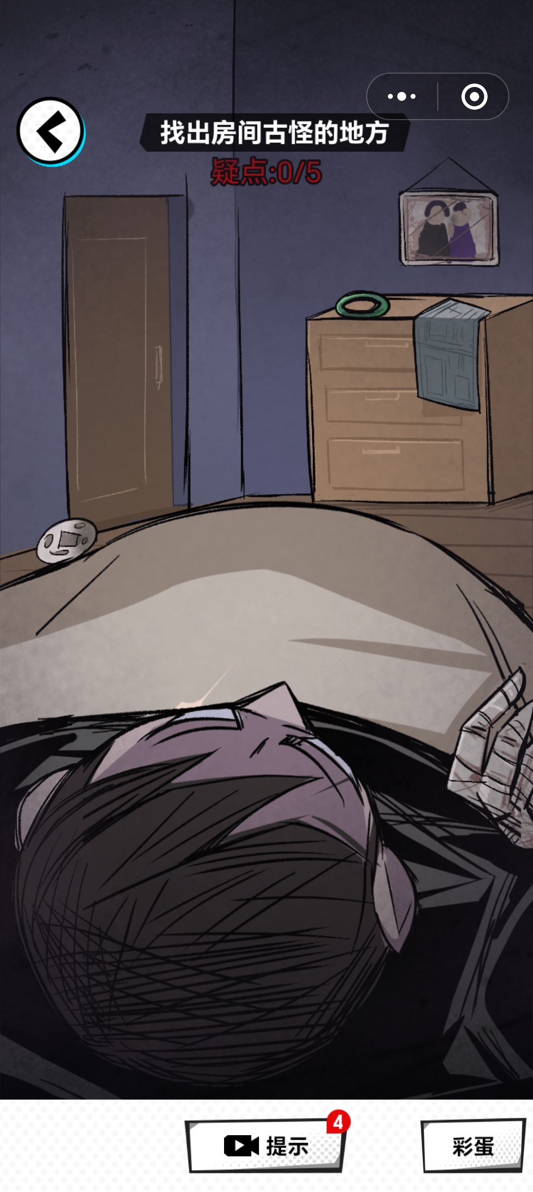 (第一关-第四关) 第一关:笼中鸟 结局一:英雄救美 1.选择(进门看看) 2.点击电脑,查看监控,与倚梅小姐对话 3.(视角左)点击拉出床底下的行李袋,拉开拉链,打开行李袋,获得【羊角锤】 4.(视角右)点击查看墙上的报纸,获得线索(4921) 5.点击查看桌子上的涂鸦 6.根据桌子上的涂鸦,按顺序和次数点击有相同图案的地砖(圆形三次、三角形一次、正方形二次) 7.打开机关,拖动【羊角锤】锤开地