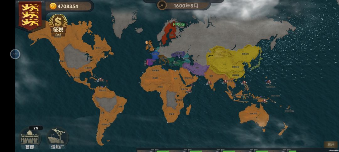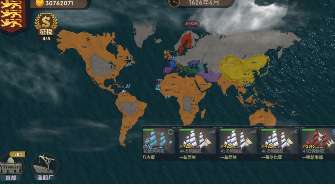 要不是时间不够,我把整个非洲给铲了(doge)北美南美收了,亚洲收了一些,澳大利亚🇦🇺收了,舰队种类全解锁。 我的思路: 前期贸易,买第二种小船,欺软怕硬,捡到软柿子就捏,再派一个小船探索,给所有未被占领的地方插旗,不至于后期收不了国家,都被别人占了。我感觉我这个模式有点bug,可以直接买高级炮。看点广告,纳点税,研究船,盖轮等高级船去自己的殖民地贸易,多赚点。后期钱越来越多,买最高档的船。好了,