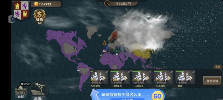 选英格兰,开局卖掉两艘小船,买五万五的那艘,加装火炮滑膛炮,有多少加多少,然后一边探索一边打。非洲到好望角都能拿下,北美拿加勒比,南美拿哥伦比亚和巴西。然后升科技,点出盖伦船,造两艘,加装火炮滑膛炮,加满以后拿下南北美。接着把红帆快船点出来,把佛郎机点出来,红帆快船造一艘,加装火炮佛郎机,有多少点多少,一边打亚洲一边把火炮点满,然后就可以拿下澳洲。剩下的时间点点科技,造几艘战舰镇压叛乱啥的