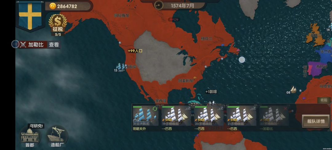 要不是时间不够,我把整个非洲给铲了(doge)北美南美收了,亚洲收了一些,澳大利亚🇦🇺收了,舰队种类全解锁。 我的思路: 前期贸易,买第二种小船,欺软怕硬,捡到软柿子就捏,再派一个小船探索,给所有未被占领的地方插旗,不至于后期收不了国家,都被别人占了。我感觉我这个模式有点bug,可以直接买高级炮。看点广告,纳点税,研究船,盖轮等高级船去自己的殖民地贸易,多赚点。后期钱越来越多,买最高档的船。好了,