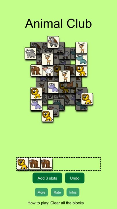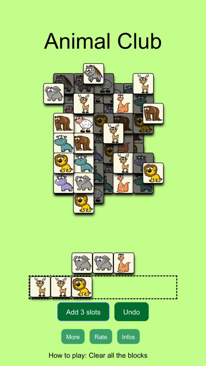 很休闲的游戏,游戏玩法简单,在游戏中需要清除所有的卡牌,收集相同的卡牌到下面的槽中,当卡牌数达到3个时就算成功了,直到清除所有的卡牌,进入下一关的挑战。需要注意的是收集卡牌的槽位最大数是7个,如果达到7个且无法完成卡牌。那么游戏结束。游戏中卡牌有多种动物花色,简直就是动物园大集合。尝试你能完成多少次挑战
